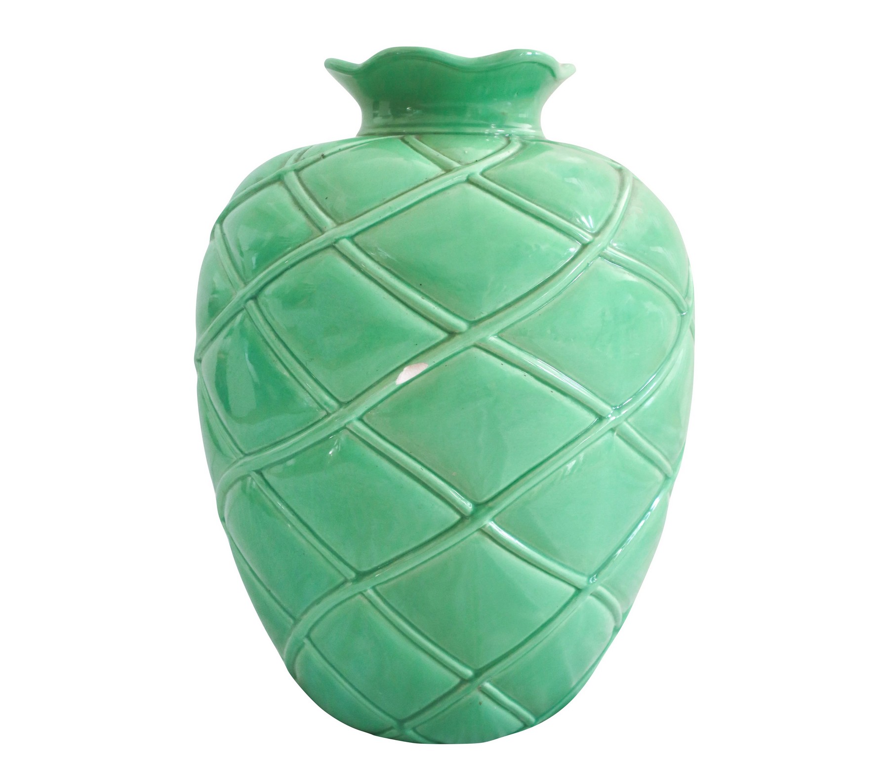 Vaso in maiolica verde di forma globulare h cm 45, diametro cm 30 Produzione italiana nello stile di G. Gariboldi. Vaso nei toni del verde acqua. Riportante decoro a sbalzo raffigurante losanghe lungo la superficie. Collo estroflesso a guisa di fiore. Presente piccola sbeccatura
