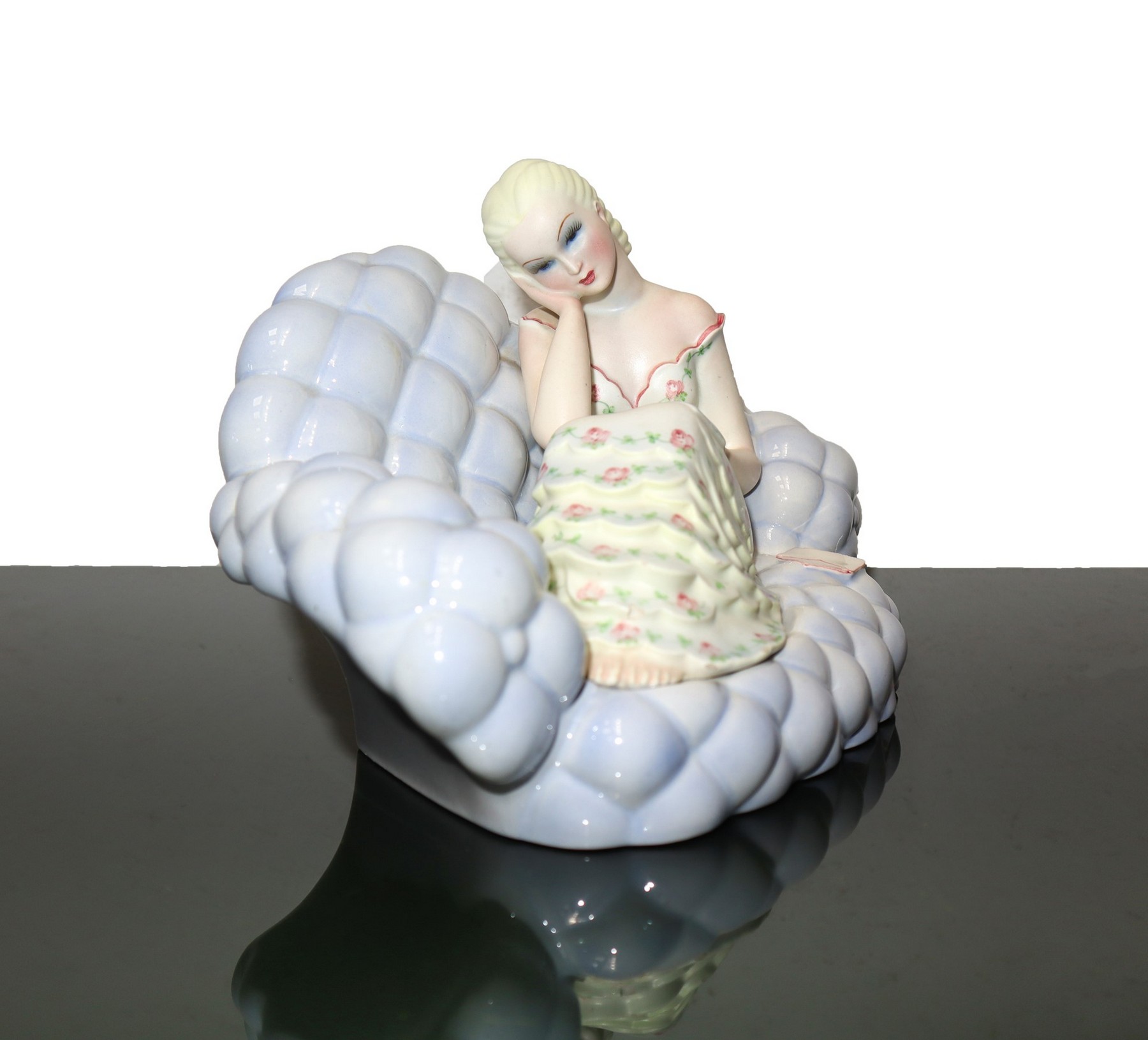 Giovanni Ronzan (produzione di) (Le Nove di Bassano del Grappa 1906-2001) - Damina intenta a leggere, 20° secolo h cm 16 x cm 25 x cm 12 Maiolica policroma Statua in terraglia modellata a colaggio. Decori floreali in policromia con finiture lucide e matte. Firmato alla base G.Ronzan Made in Italy