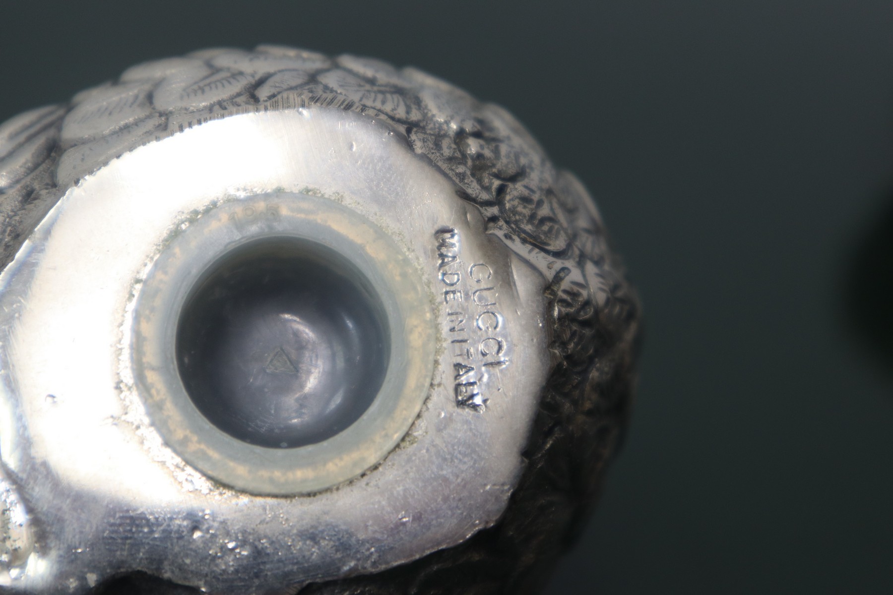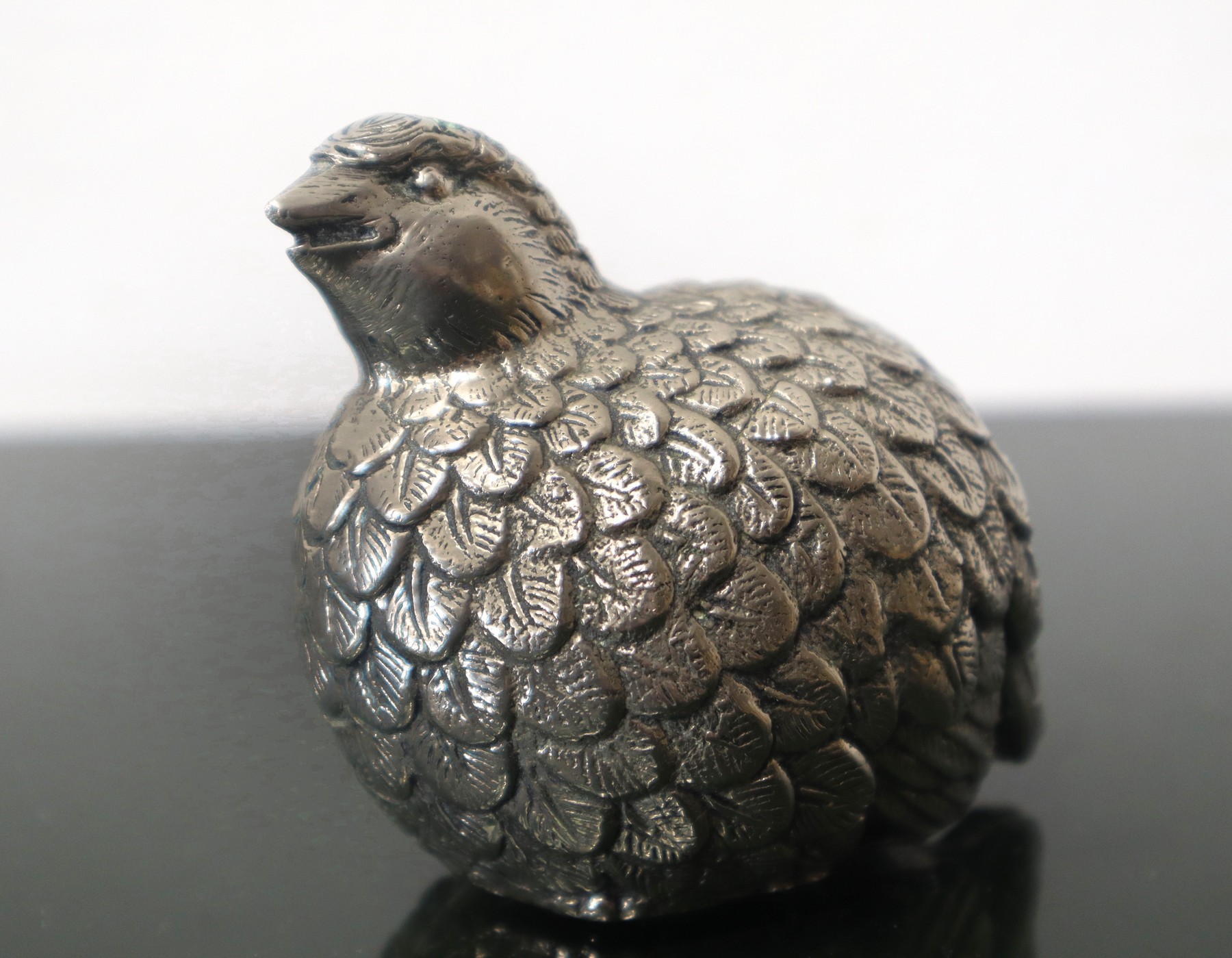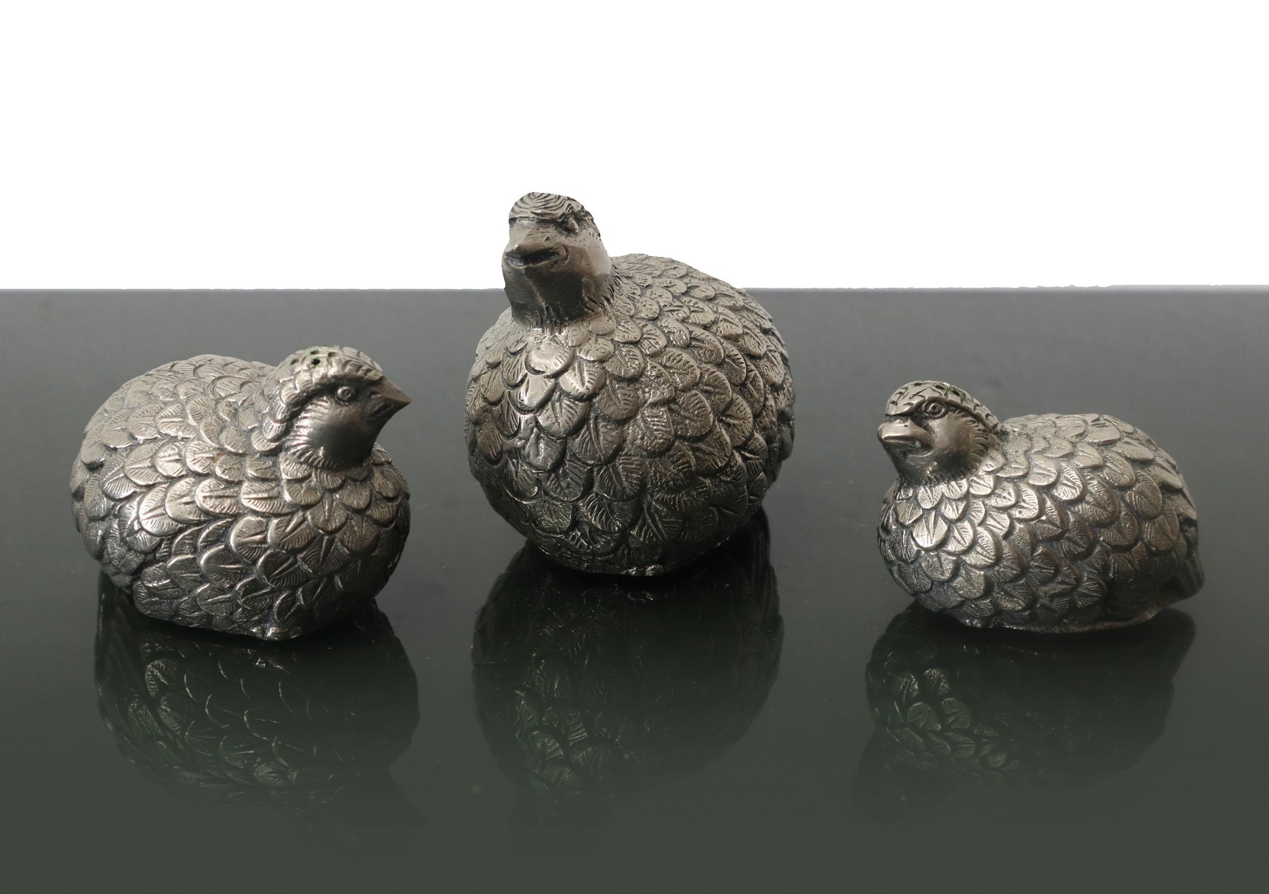 Gucci - Tris sale e pepe composto da tre quaglie in peltro argentato , 60s/70s. Grande : cm 8 h x 8 L, Media cm h 7 x 7L, piccola cm 6 H x 6L Marchiate alla base