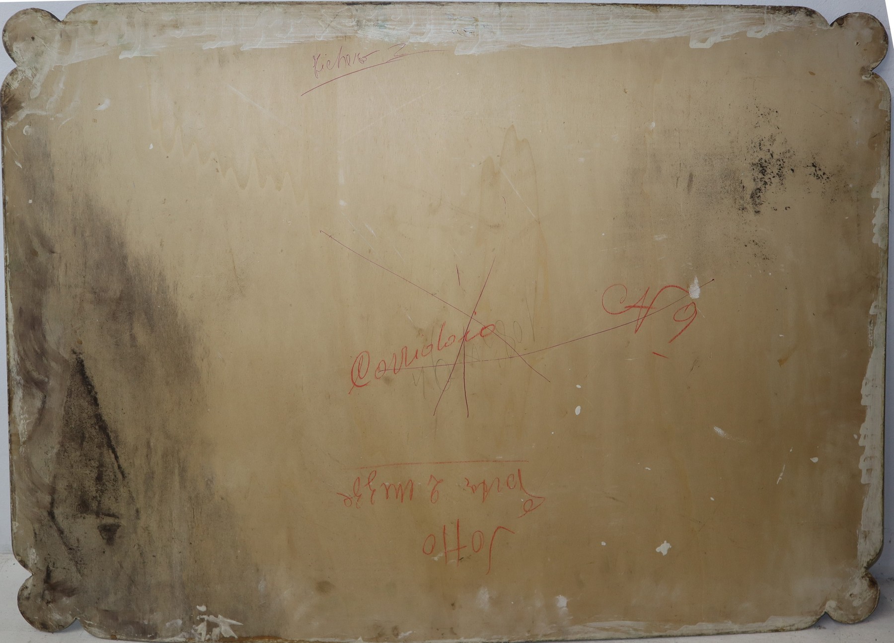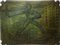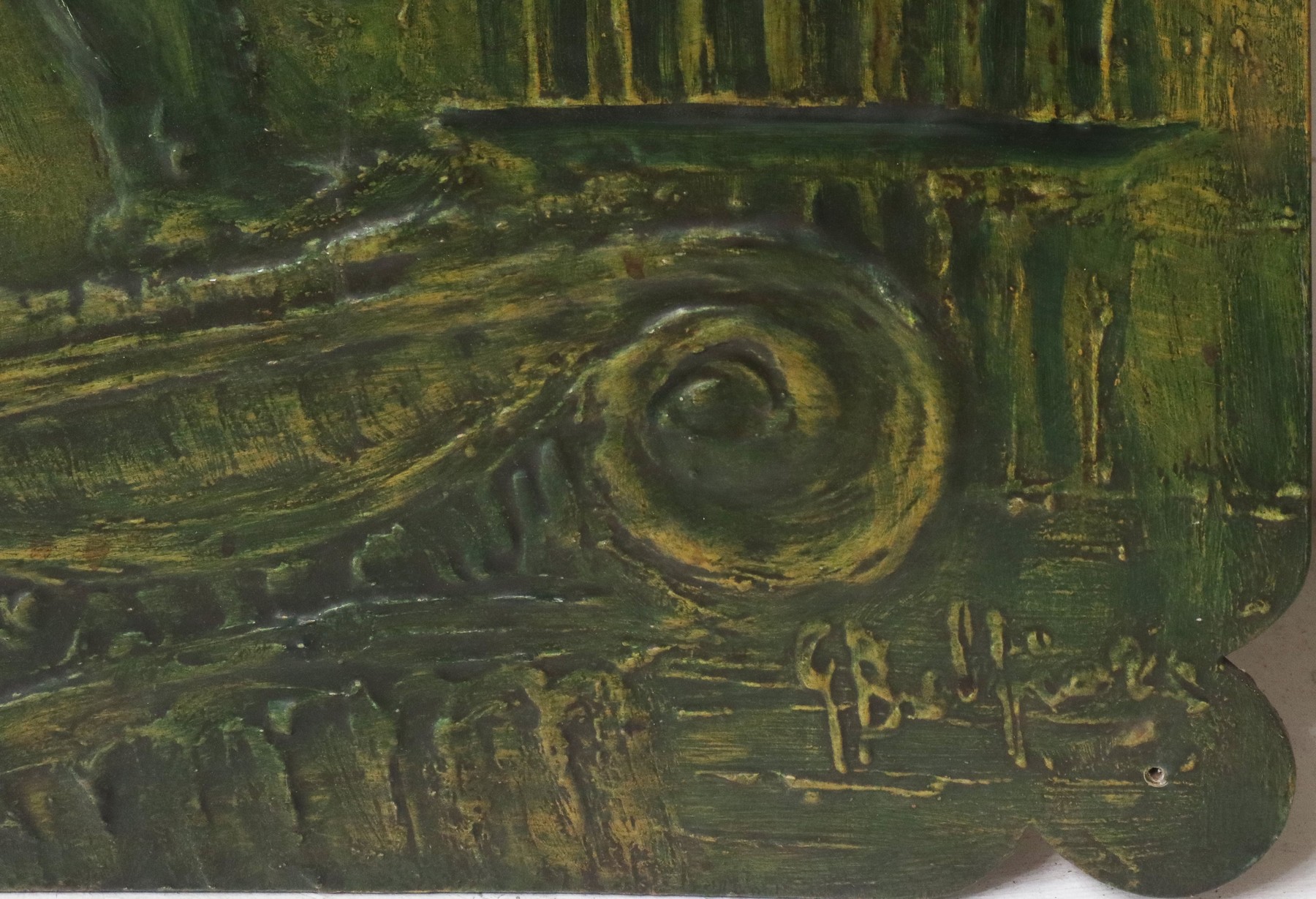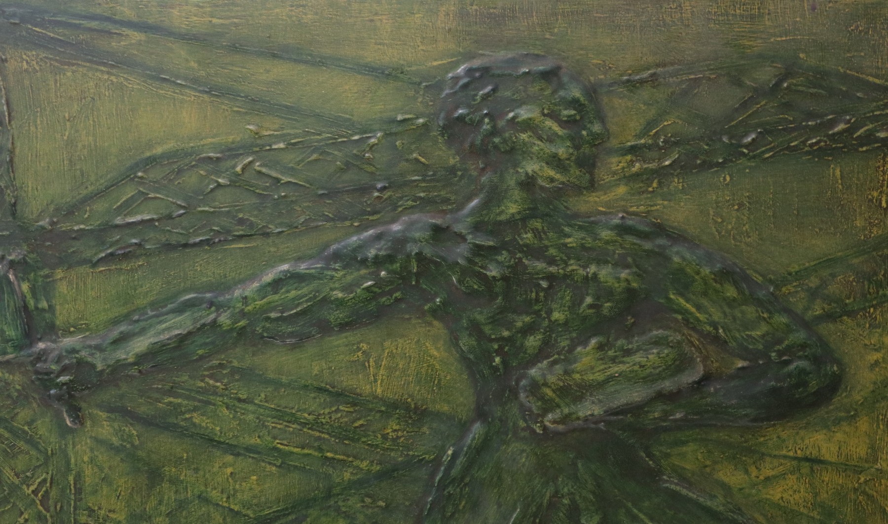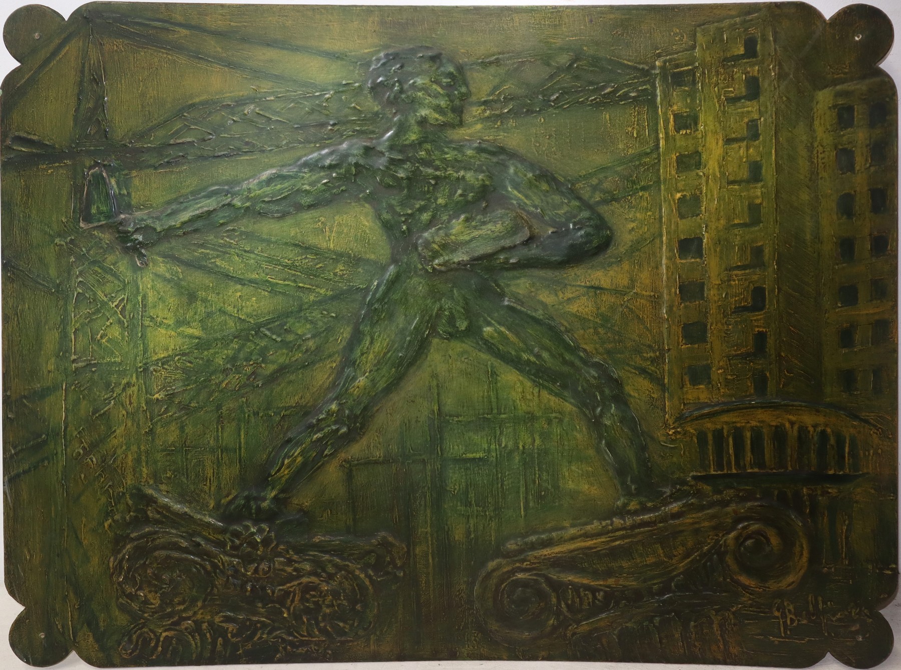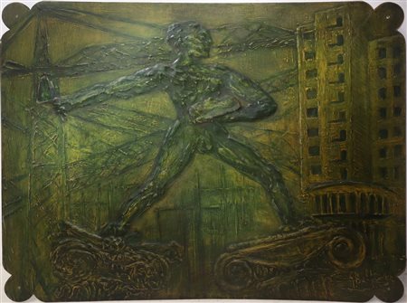 G. Belfiore - Panello decorativo raffigurante Uomo su colonne e gru nei toni del verde H cm 84 x L cm 108 Tecnica mista su tavola in legno Firmato sul fronte in basso a destra