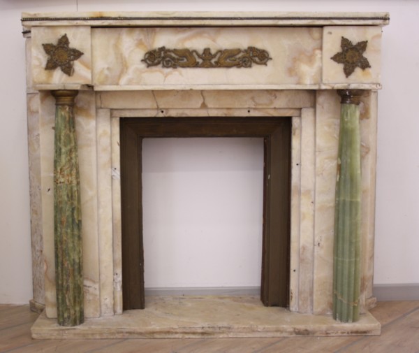 Camino in alabastro chiaro con colonne scanalate in alabastro verde e decorazioni in bronzo dorato. Inizi XX secolo. Difetti. Mis. Lung. cm. 120 Alt. cm. 110 Prof. cm. 36 ca.