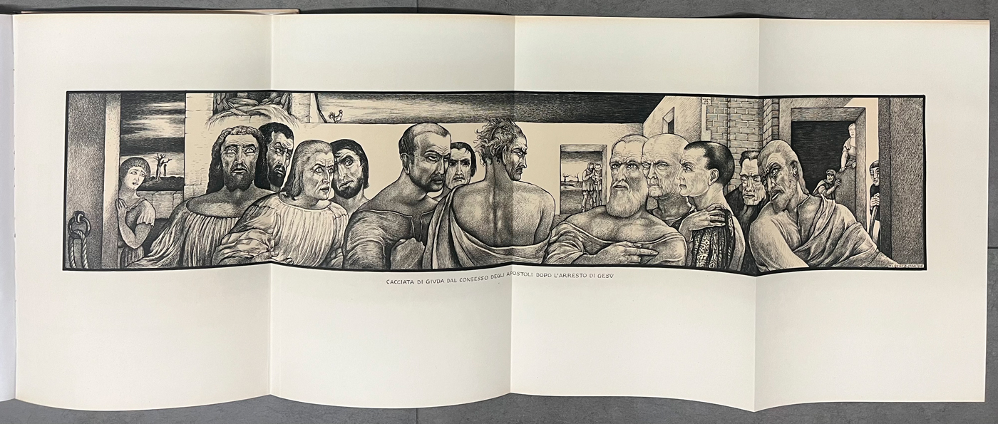 Catalogo riccamente illustrato contenente 2 tavole litografiche (La famiglia del pescatore e Il conte Ugolino e l'Arcivescovo Ruggeri) e un'immagine più volte ripiegata (Cacciata di Giuda dal consesso degli Apostoli dopo l'arresto di Gesù)