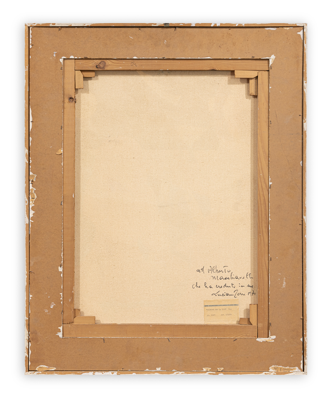 Firma, dedica ad personam ed etichetta dell'Artista con titolo e datazione al retro