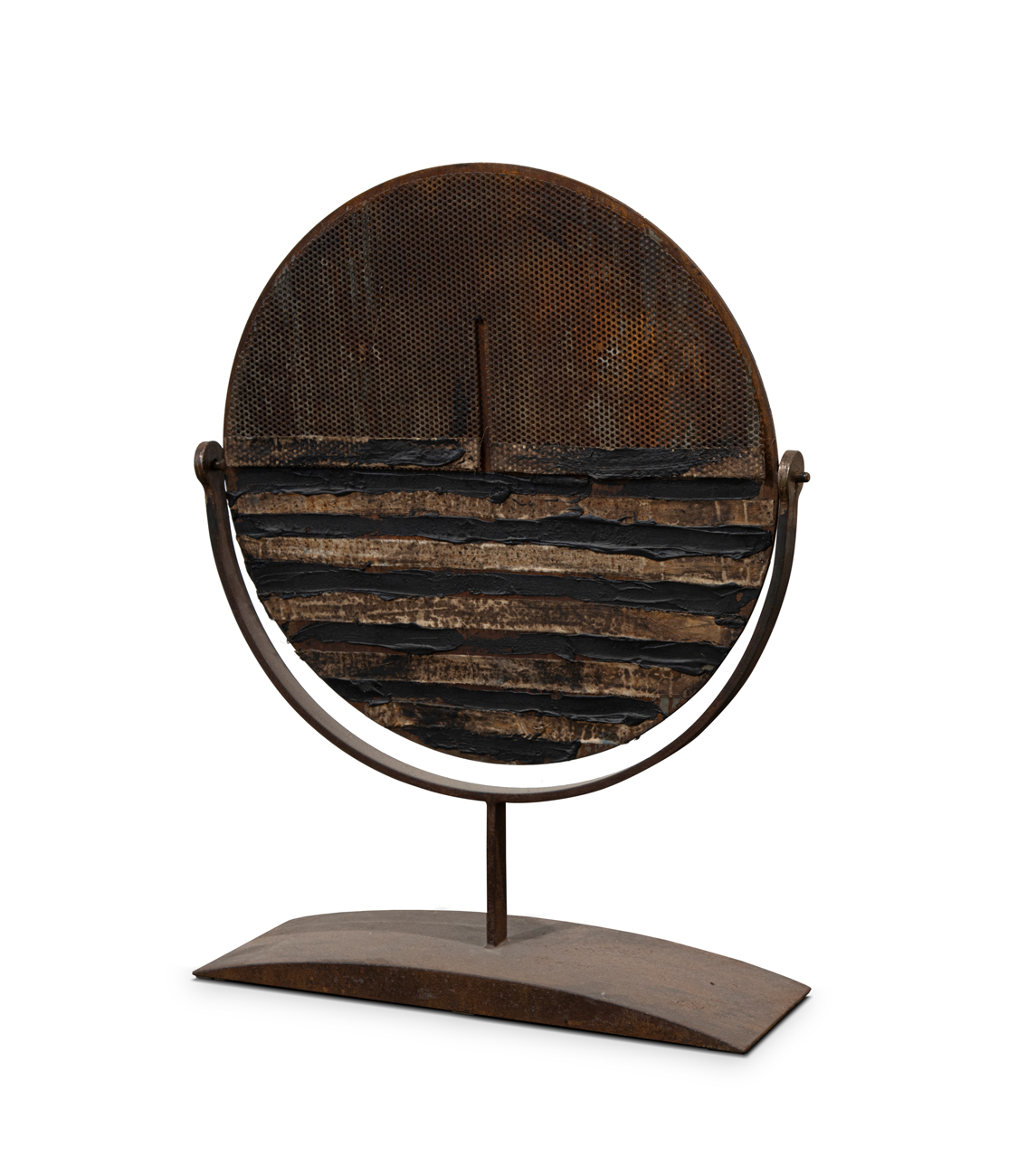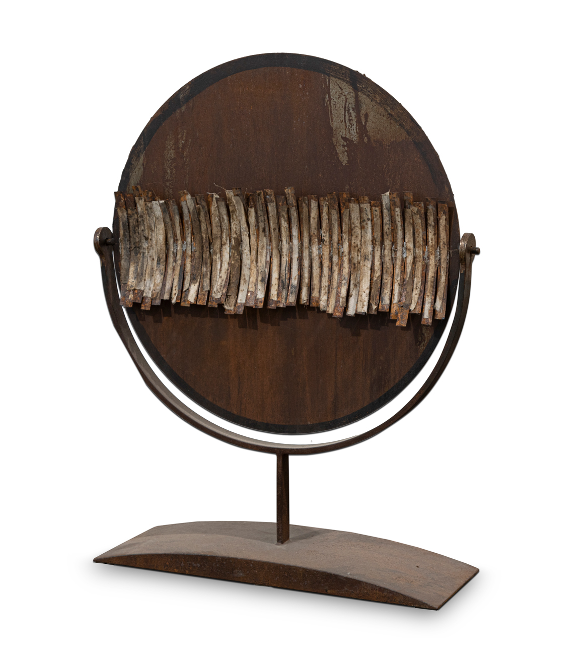 Scultura in ferro con elemento girevole lavorato su entrambi i lati con applicazioni