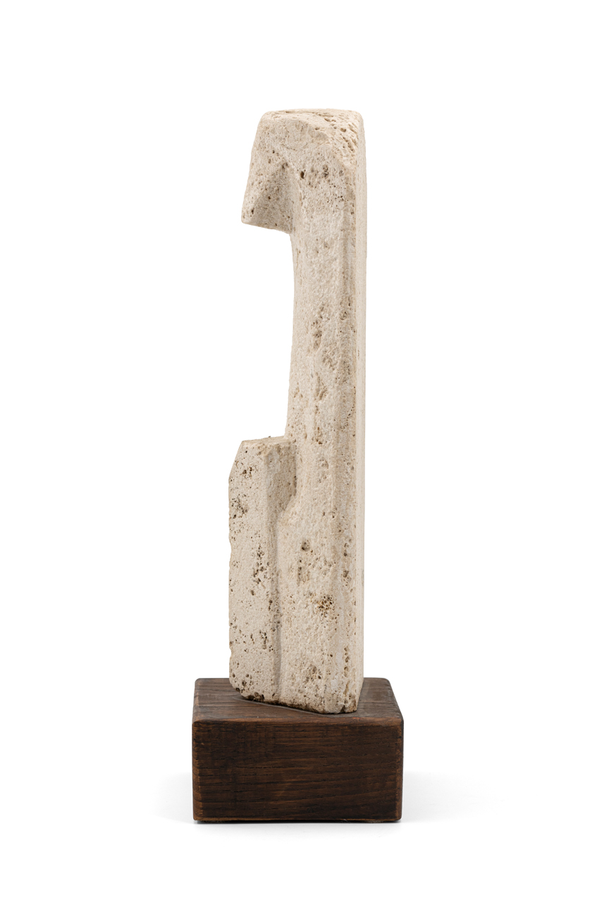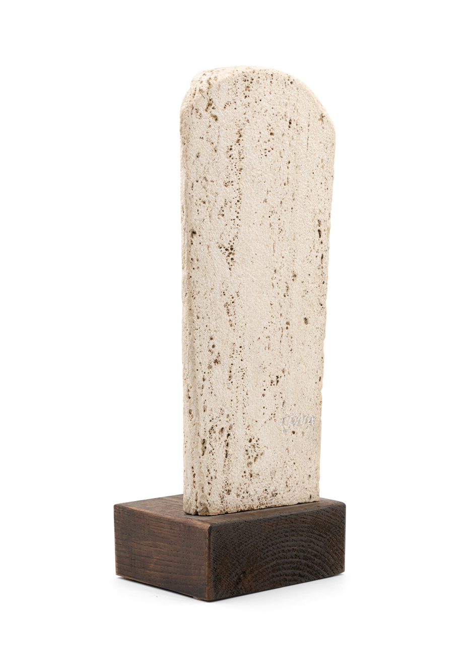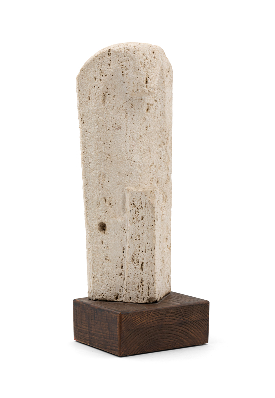 Scultura in travertino romano poggiante su base in legno