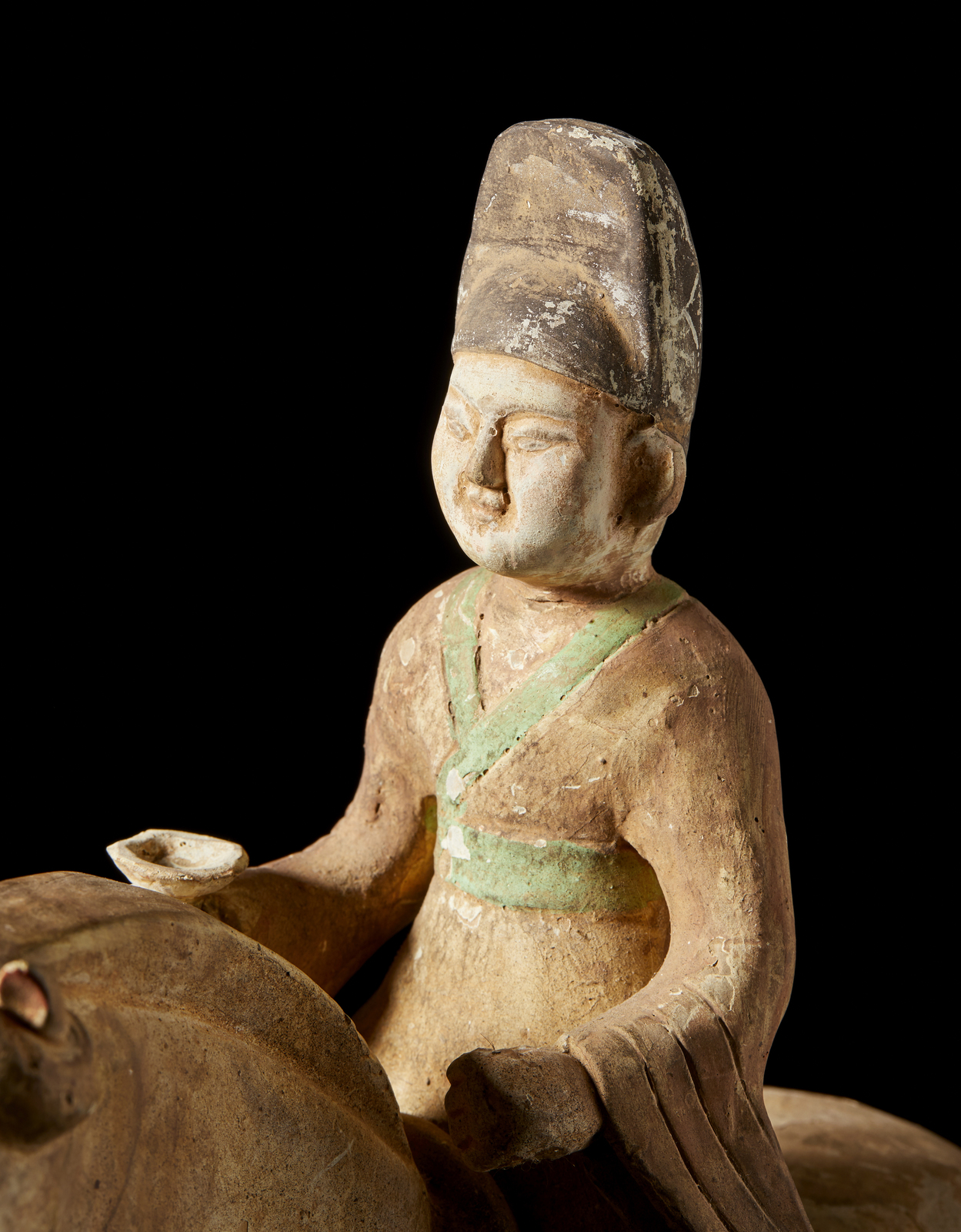 Cina, dinastia Tang, IX secolo . . Cm 35,00 x 42,00. bella scultura fittile realizzata a stampo raffigurante un cavaliere in ricca veste cerimoniale. Il corpo in terracotta mantiene ancora tracce della antica policromia.