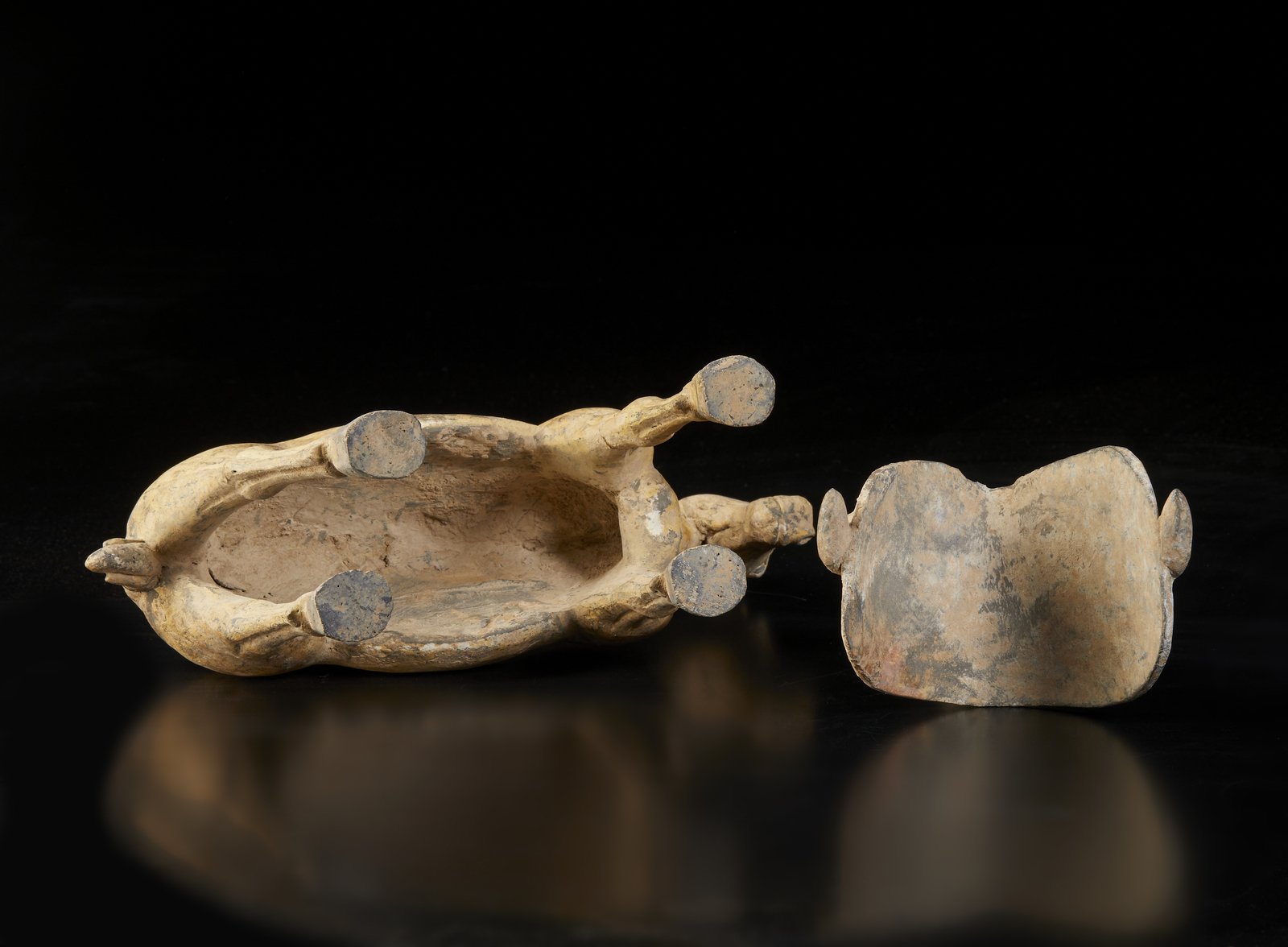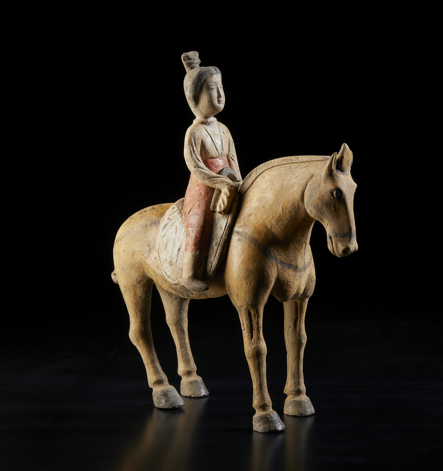 Arte Cinese - Statua in terracotta raffigurante fanciulla a cavallo Cina, dinastia Tang, IX secolo.
