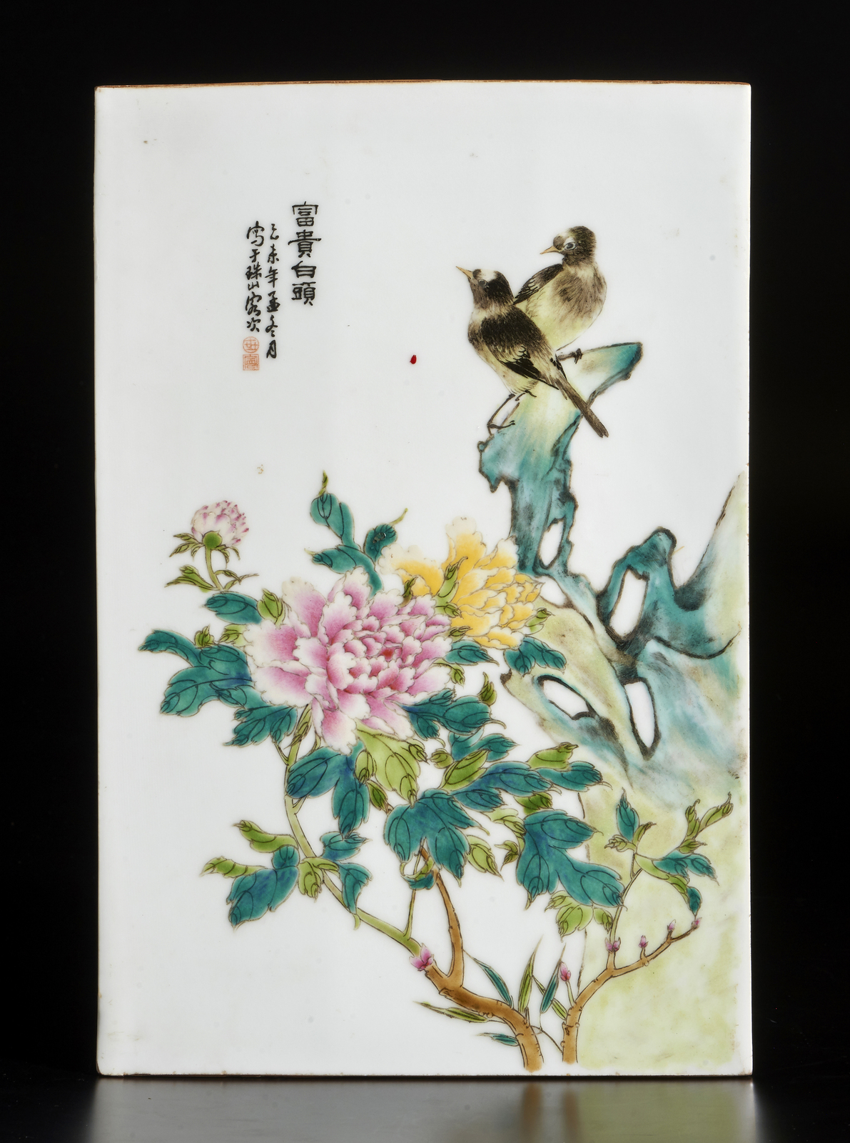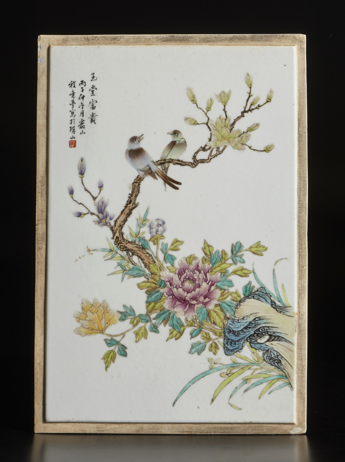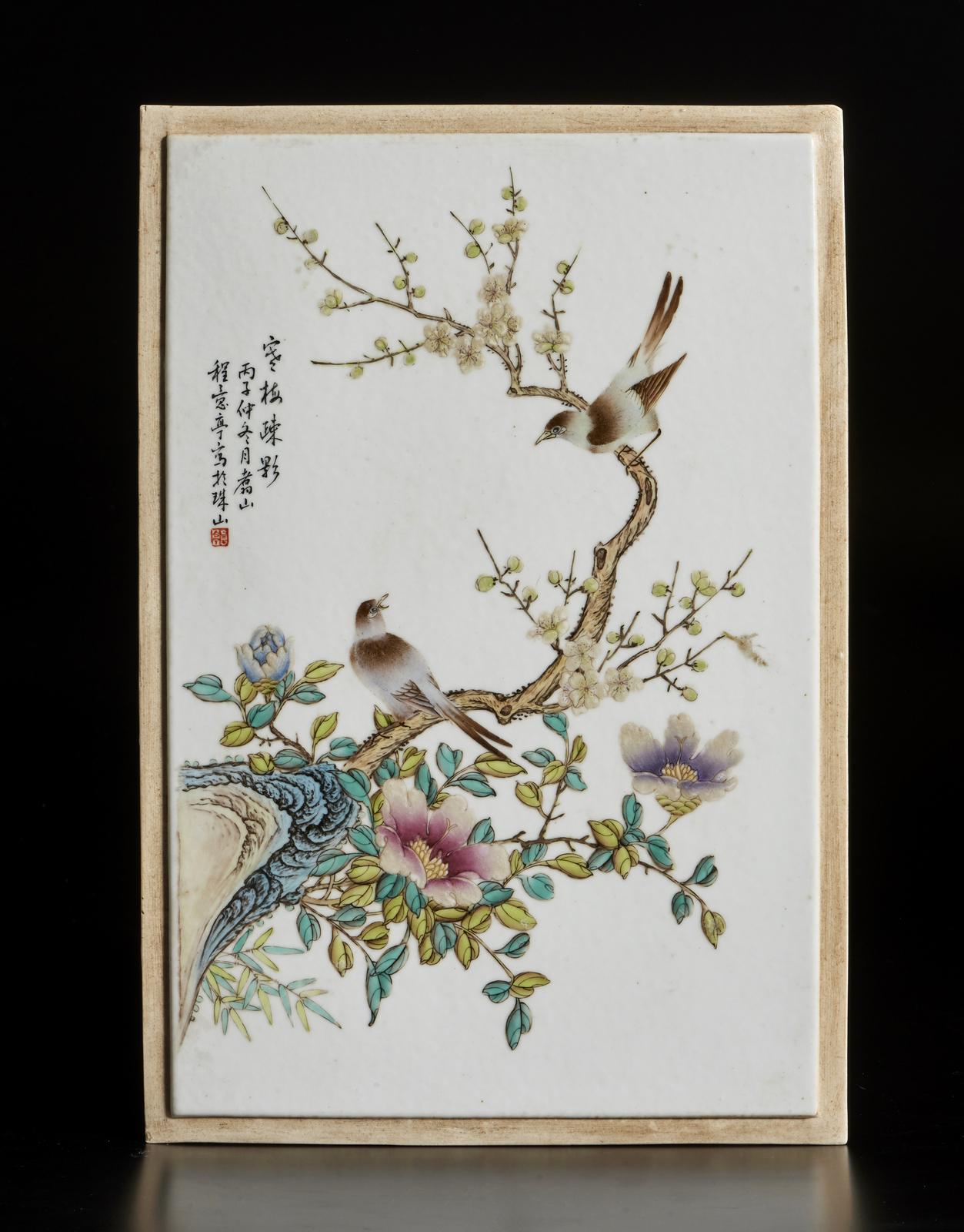 Cina, inizio XX secolo . . Cm 25,50 x 39,00. Dipinte con uccelli su rami fioriti ed iscrizioni.