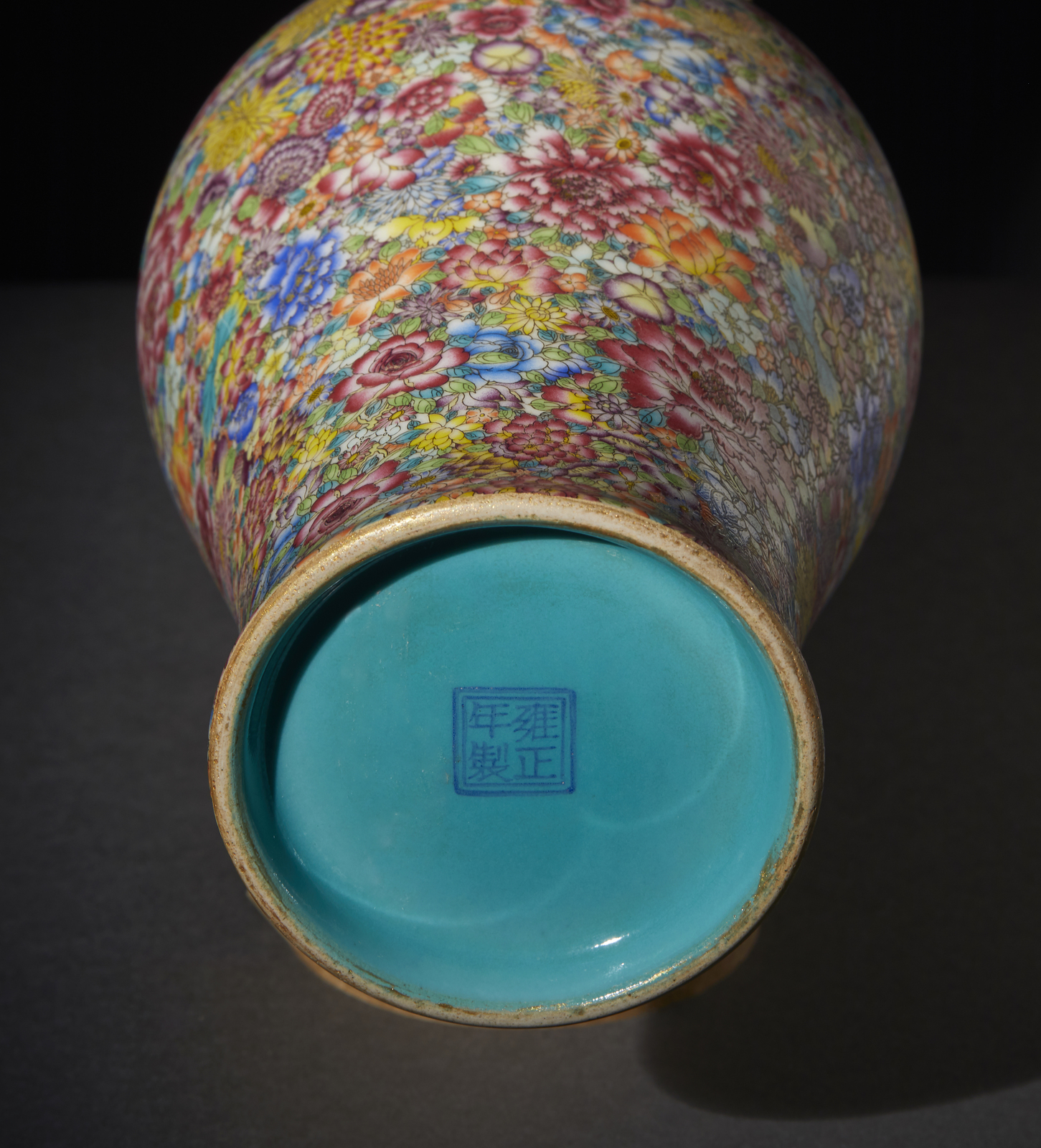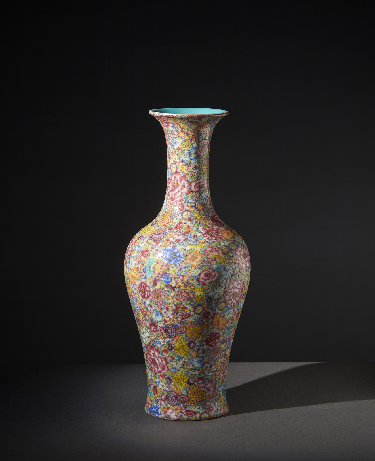 Cina, periodo Repubblica. . Cm 12,50 x 33,50. Vaso a balaustro con bocca eversa, l'esterno decorato con il classico motivo millefiori. Marchio Yongzheng a quattro caratteri sulla base.