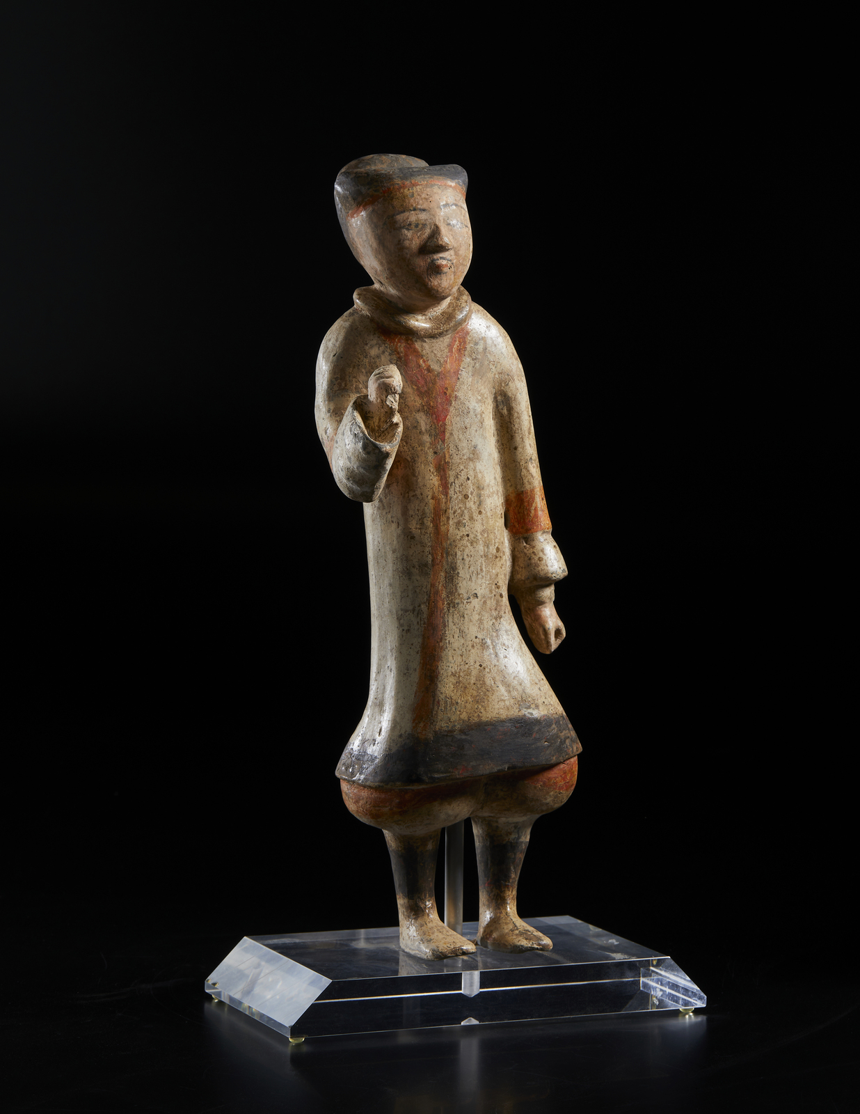 Cina, dinastia Han, I secolo . . Cm 13,50 x 44,00. Scultura fittile policroma raffigurante un cortigiano in abiti lunghi.