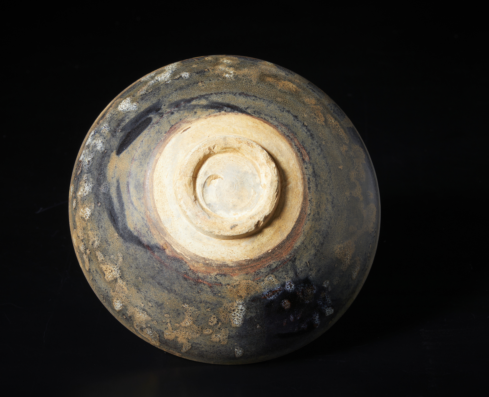 Cina, dinastia Song, X secolo o posteriore . . Cm 15,50 x 6,20. Tazza in ceramica a corpo pesante, con spessa invetriatura maculata che lascia scoperto il piede, Questo tipo di porcellana, diffusosi in Cina in epoca Song, prende il nome di Jian yao perche prodotta nei forni della omonima provincia del Fujian.
