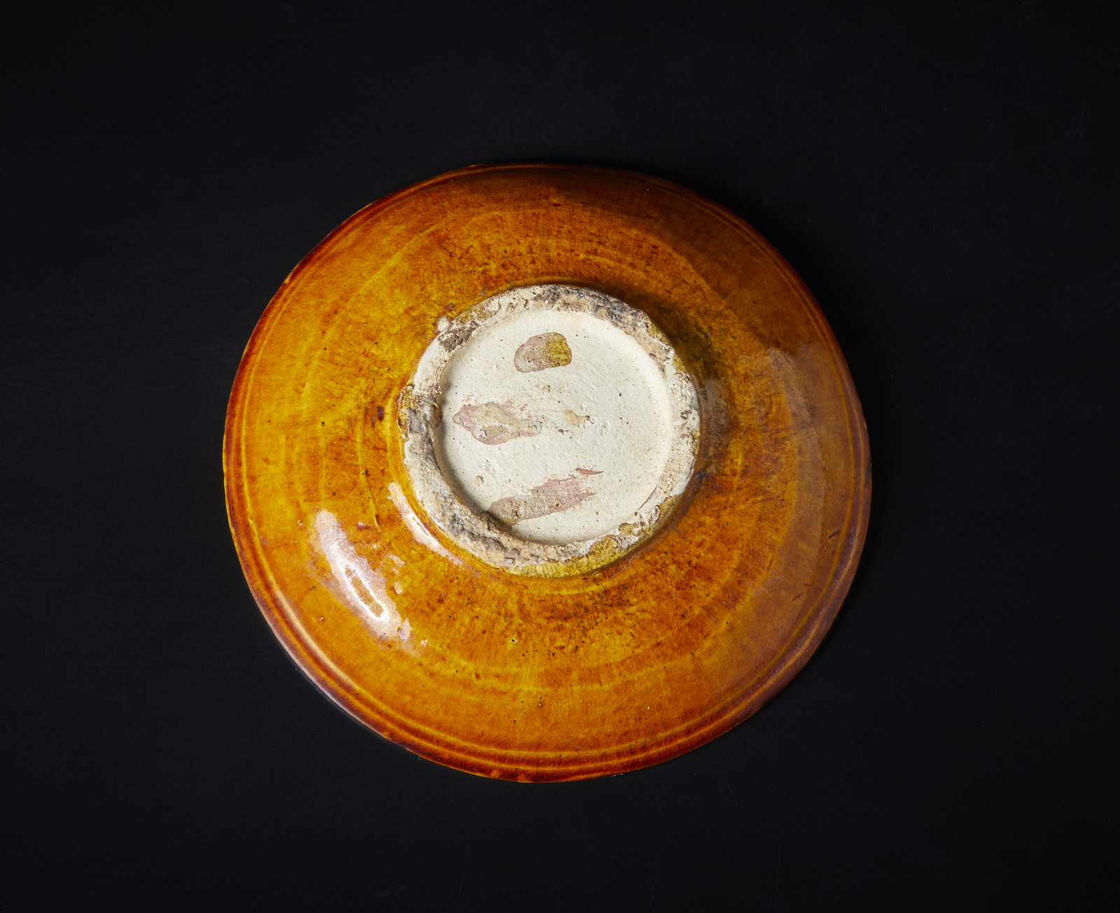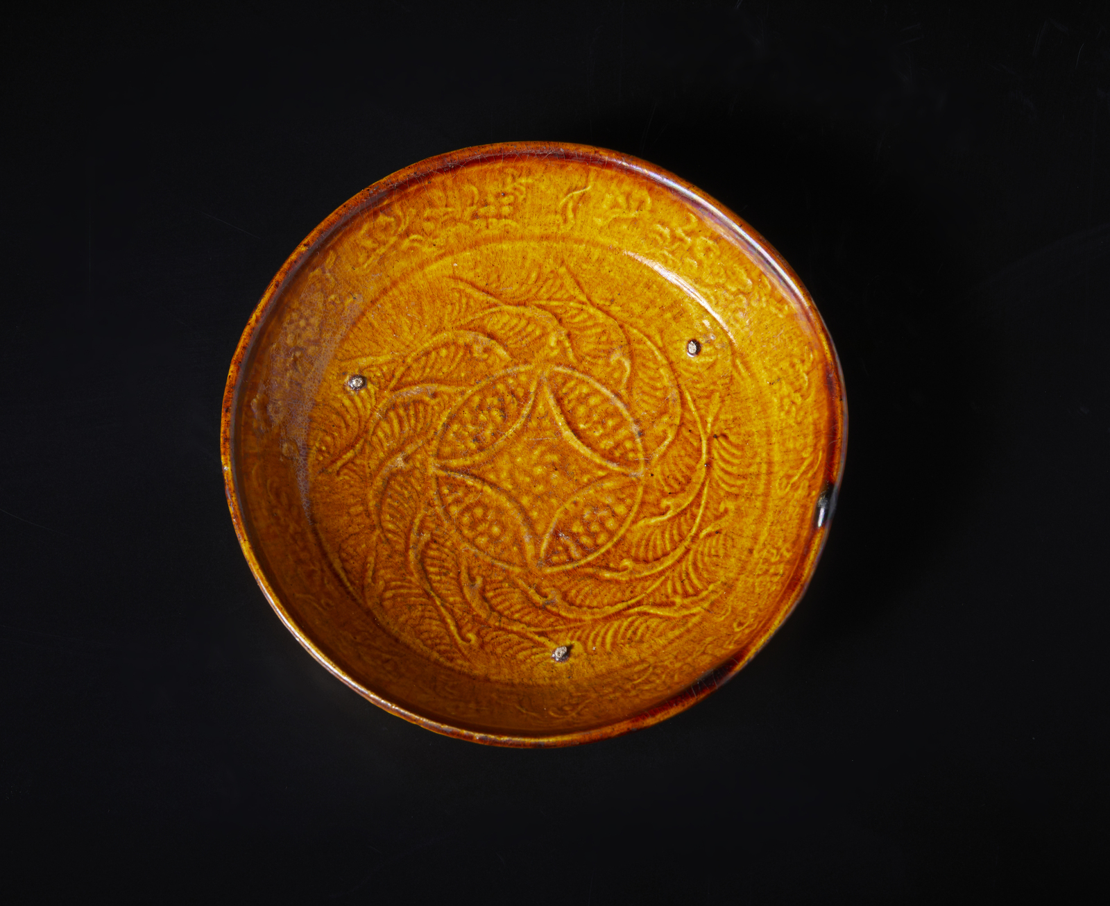 Cina, dinastia Liao, X secolo . . Cm 13,00 x 3,40. tazza in ceramica a decoro floreale stampato, ricoperta da vivace invetriatura color ambra.