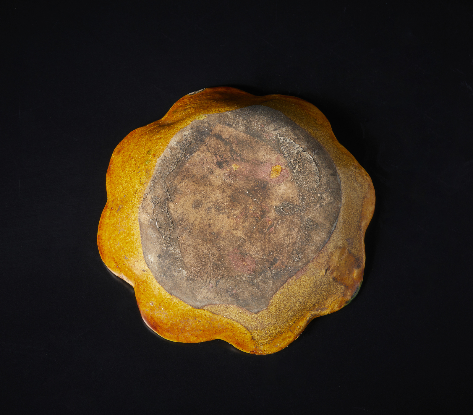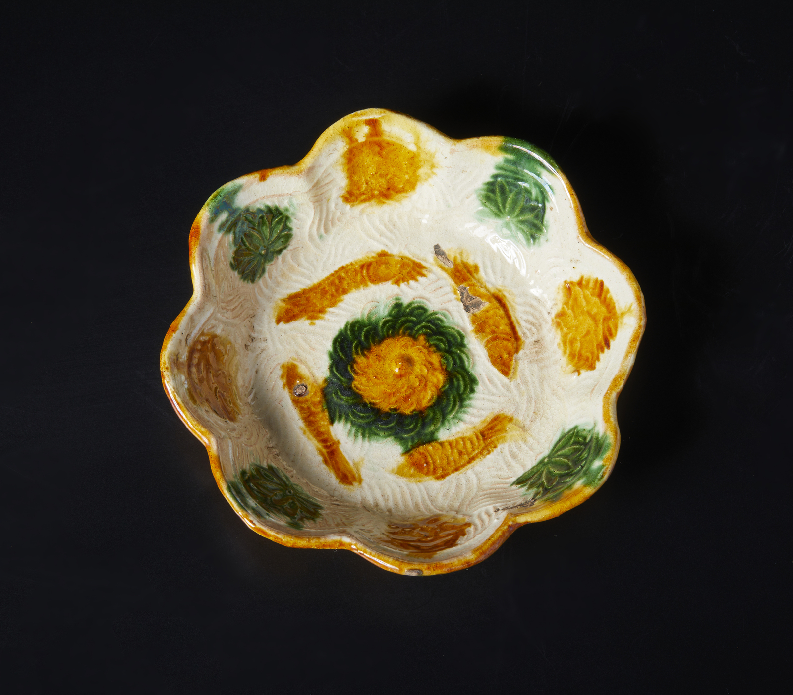 Cina, probabilmente dinastia Tang, IX secolo . . Cm 12,70 x 2,50. In ceramica con orlo lobato, ricoperta di vetrina nei delicati colori terrosi sancai e decorata con motivi impressi di matrice floreale e due coppie di pesci che nuotano sul fondo.