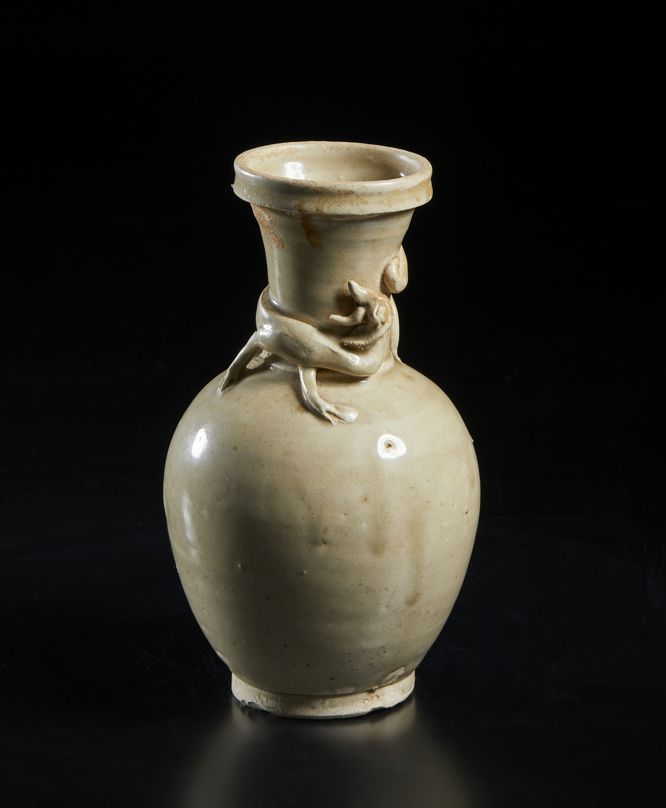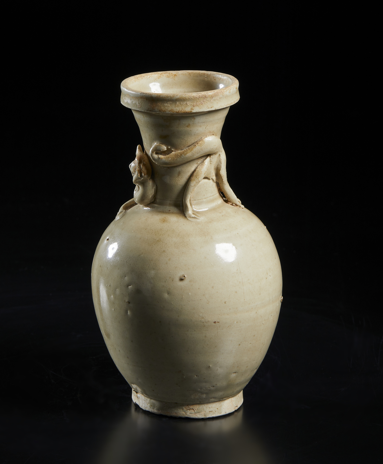 Cina, dinastia Song, XII secolo. . Cm 12,50 x 22,50. Vaso a balaustro in ceramica invetriata verde pallido con decoro a rilievo di Qilong.