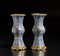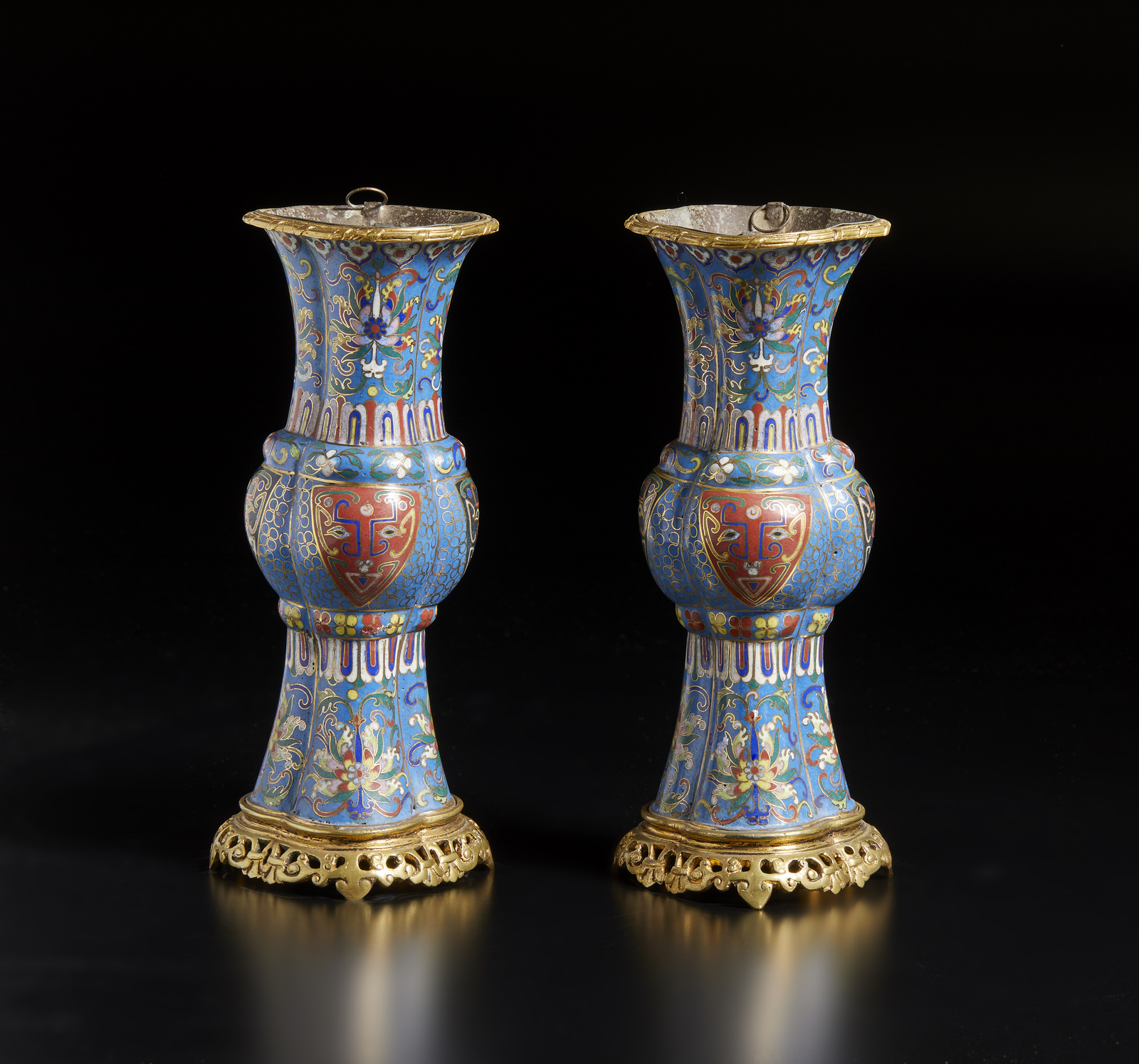 Cina, dinastia Qing, XIX secolo . . Cm 9,00 x 20,50 x 9,00. Coppia di vasi "Gu" in metallo smaltato a fondo blu con decoro di fiori di loto e riserva centrale in forma di Tao-tie.