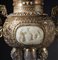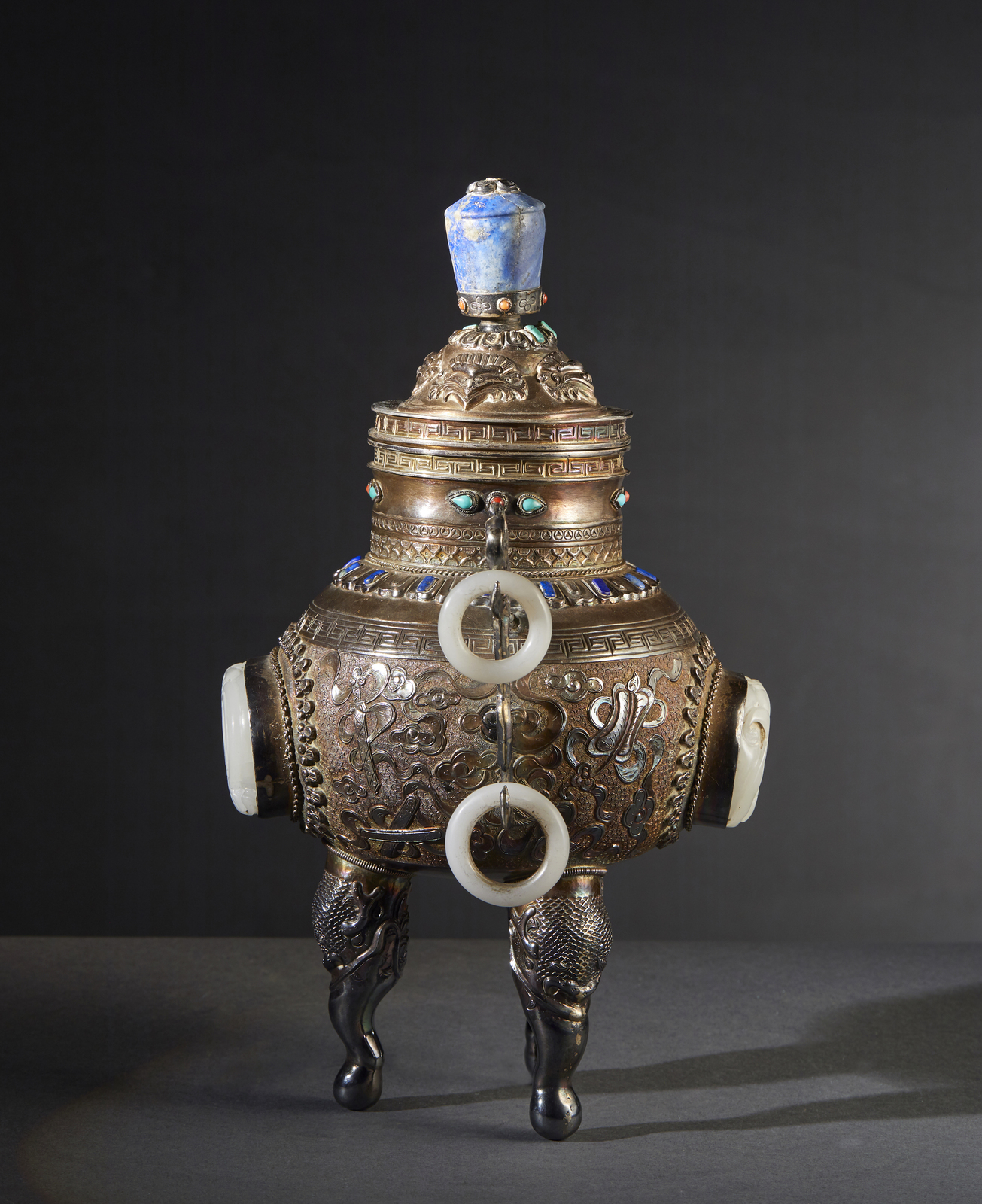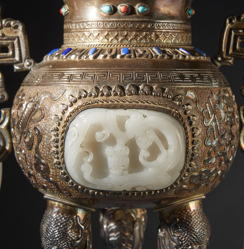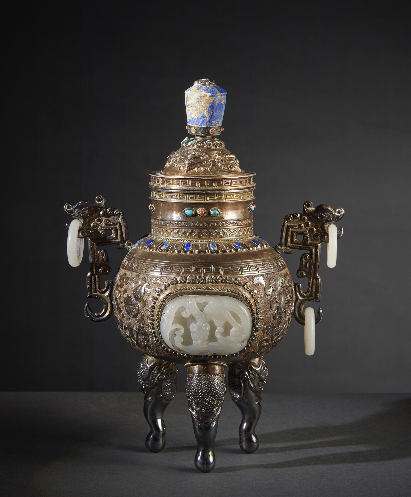 Cina, dinastia Qing, fine XIX secolo. . Cm 21,00 x 29,00. Incensiere in argento sbalzato e cesellato con incrostazioni in giada, turchese, corallo e lapislazulo. Il corpo globulare, poggiante su tre piedi in forma di Makala, è impreziosito da due grandi intagli in giada bianca lavorati a bassorilievo con figure di qilong e da due vistosi manici in forma di drago stilizzato, con anelli di sospensione in giada bianca. Il breve collo cilindrico sormontato da un coperchio con impugnatura in lapislazuli.