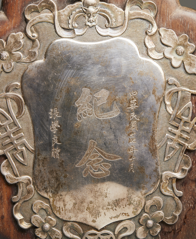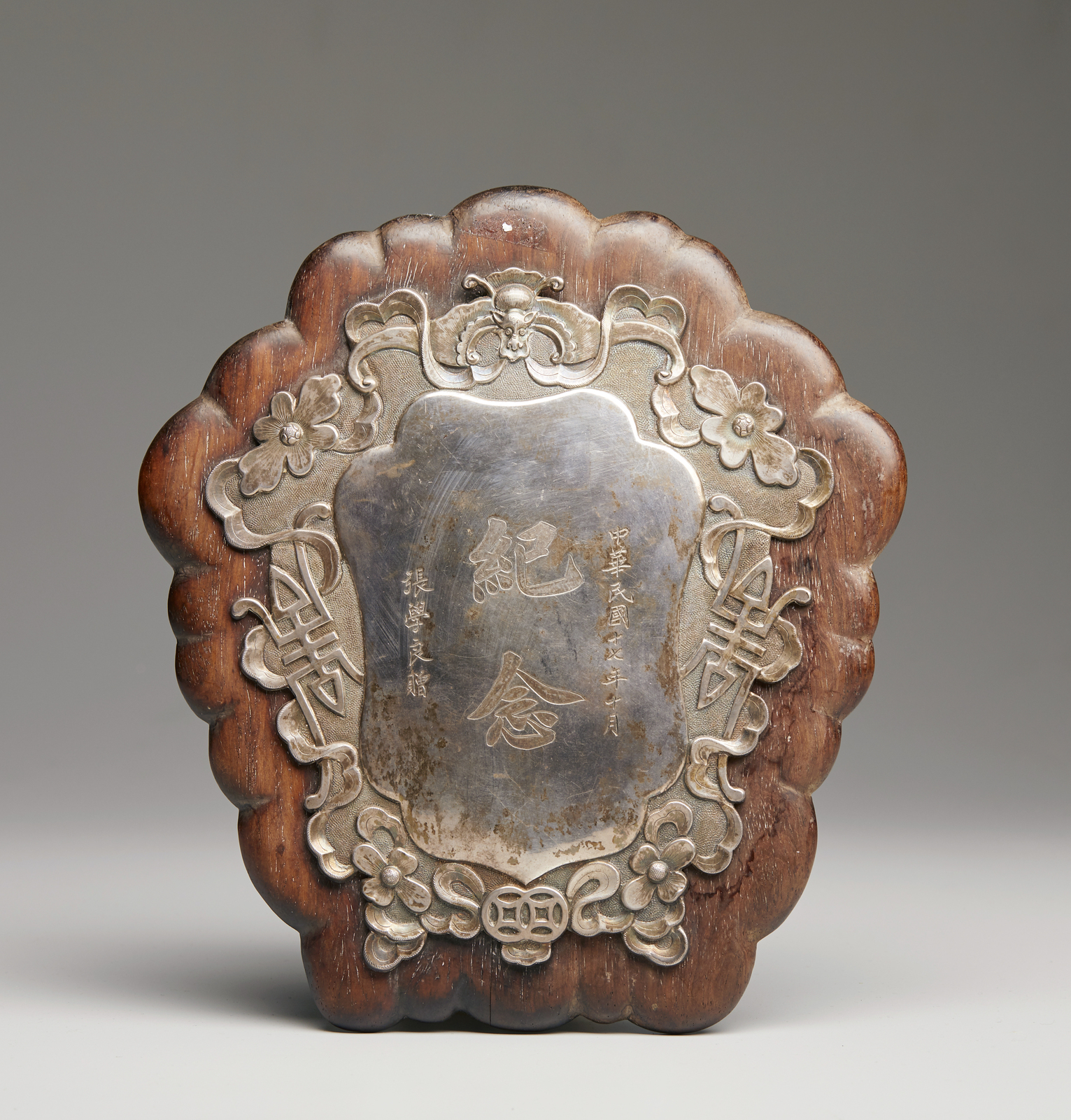 Arte Cinese Placca in metallo sbalzato ed inciso. . Cm 15,00 x 16,50. placchetta decorativa, forse in argento, lavorata a sbalzo con motivi beneaugurali di pipistrelli e simboli Shou a cornice della iscrizione centrale incisa.