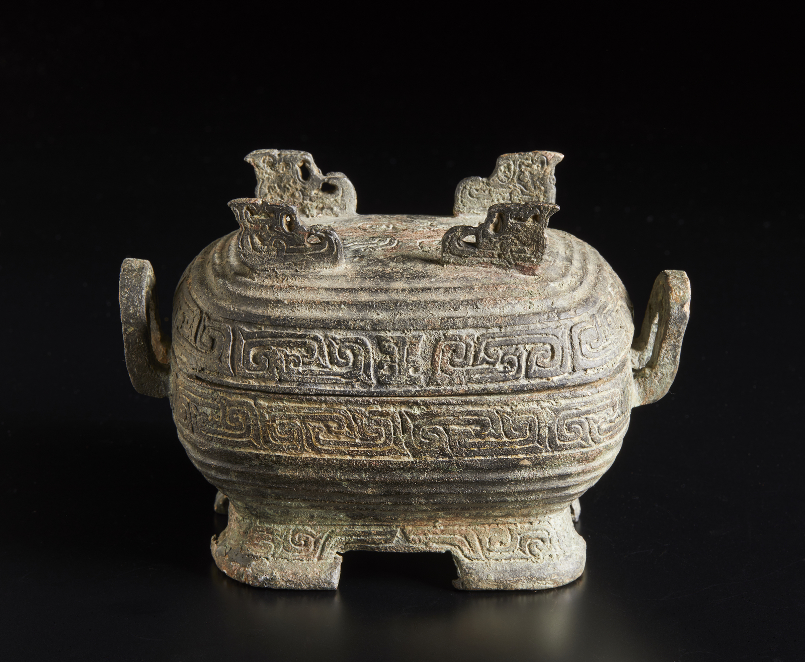 Cina, dinastia Song (?), X secolo (?). . Cm 15,20 x 11,50. Scatola quadrangolare con coperchio e manici poggiante su quattro piedi. Realizzata secondo i modelli rituali di epoca Shang, presenta l'intera superficie esterna decorata a motivi geometrici incisi e numerose iscrizioni dedicatorie incise all'interno e sopra il coperchio.