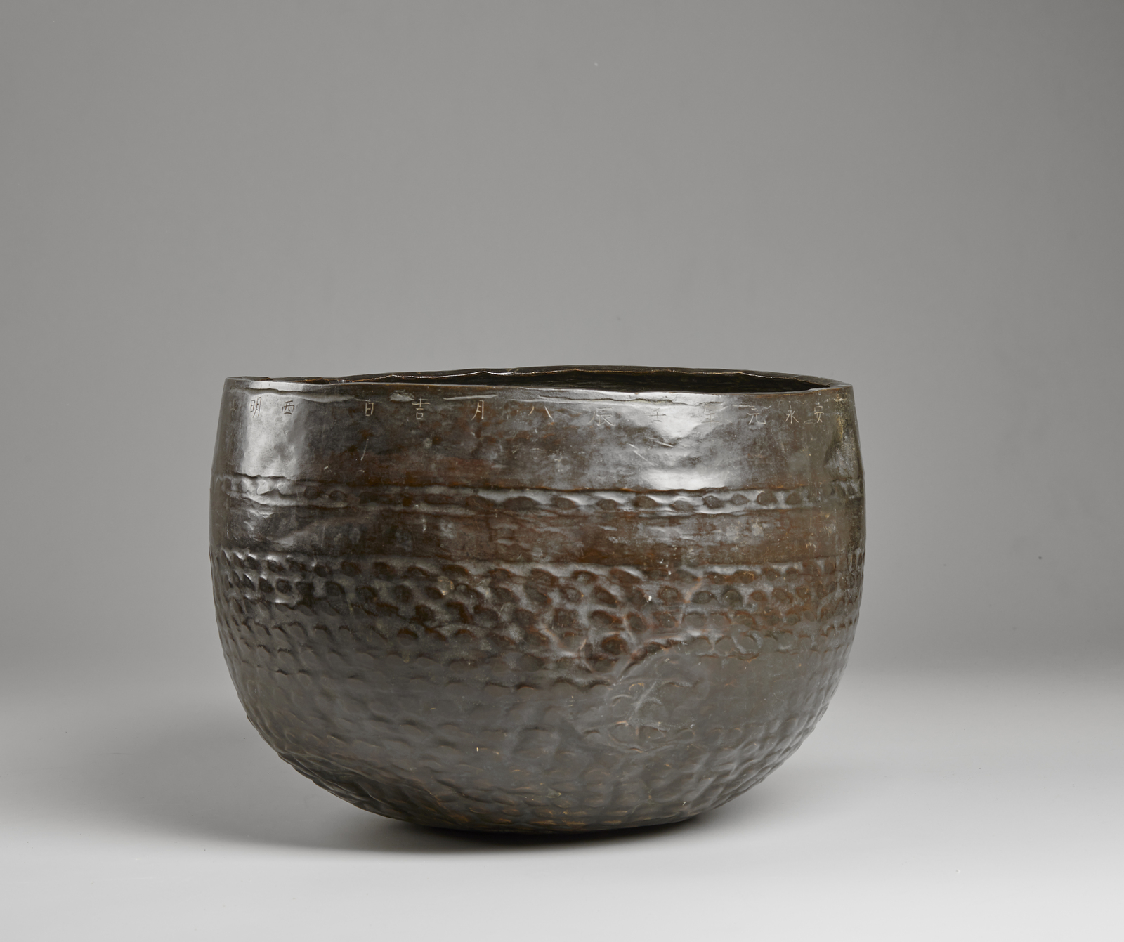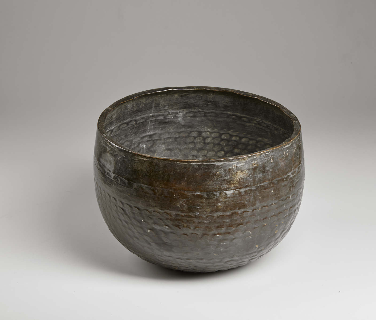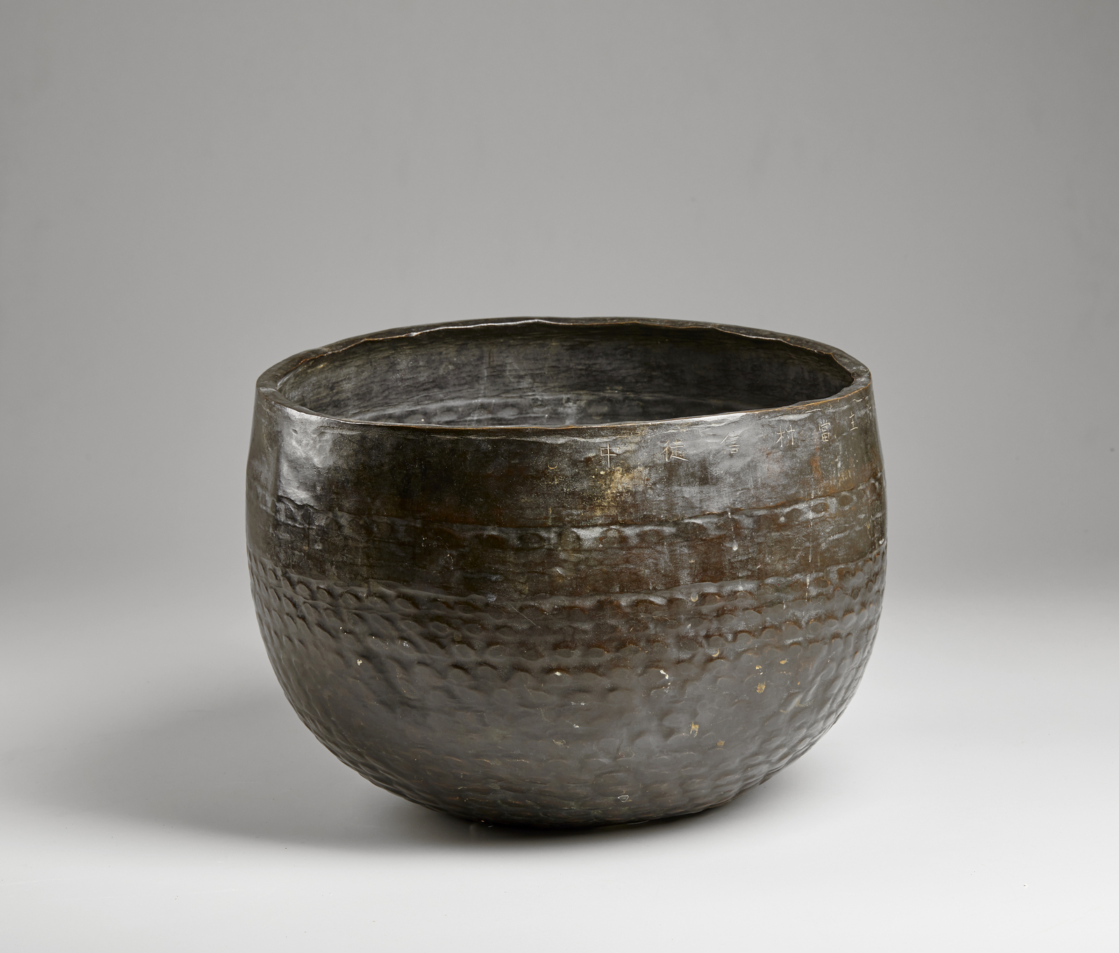 Cina, dinastia Ming, XVII secolo. . Cm 36,50 x 25,50. grande contenitore semisferico in metallo sbalzato con estesa iscrizione dedicatoria incisa sul bordo superiore.