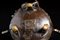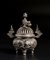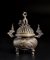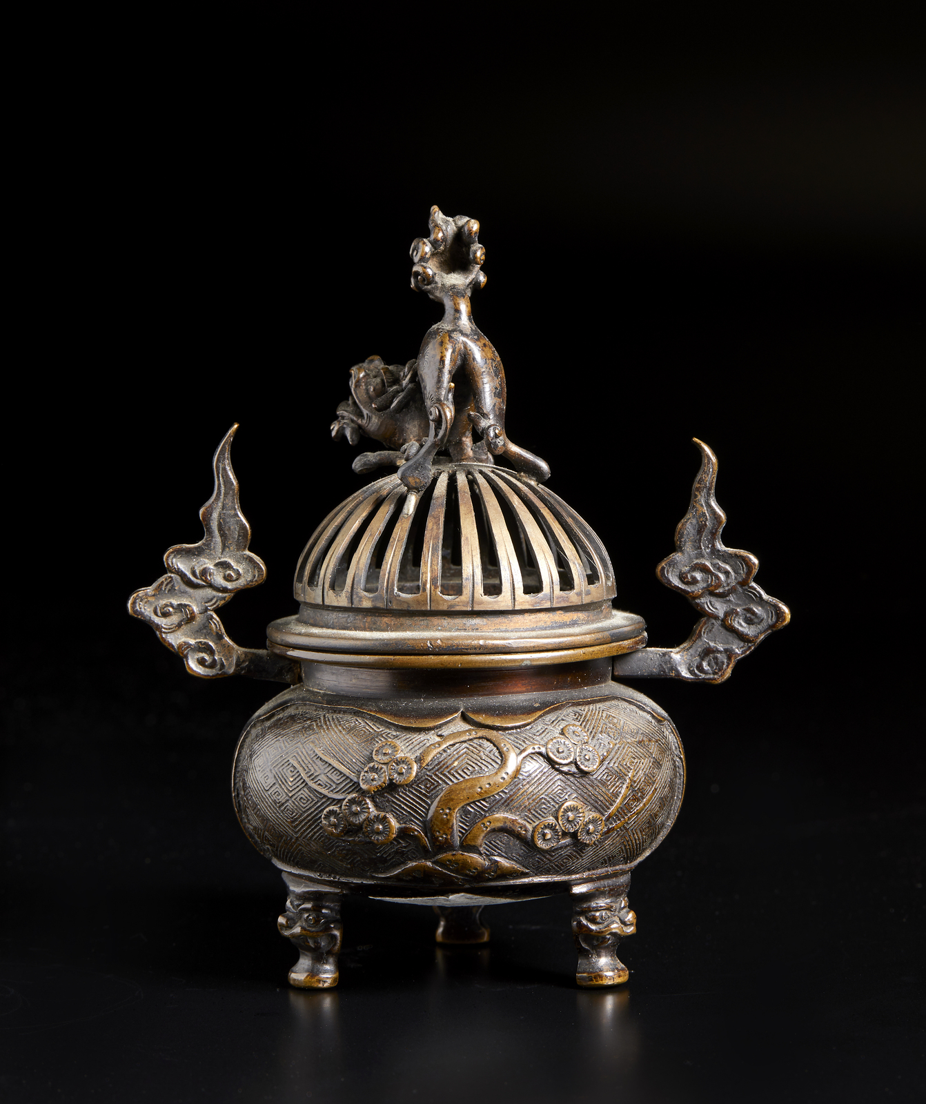 Cina, dinastia Qing, XVIII secolo . . Cm 14,00 x 16,50 x 11,00. contenitore per incenso di forma circolare in bronzo a patina bruna lavorato a rilievo con figure di leoni e coperchio traforato sormontato da leone buddista