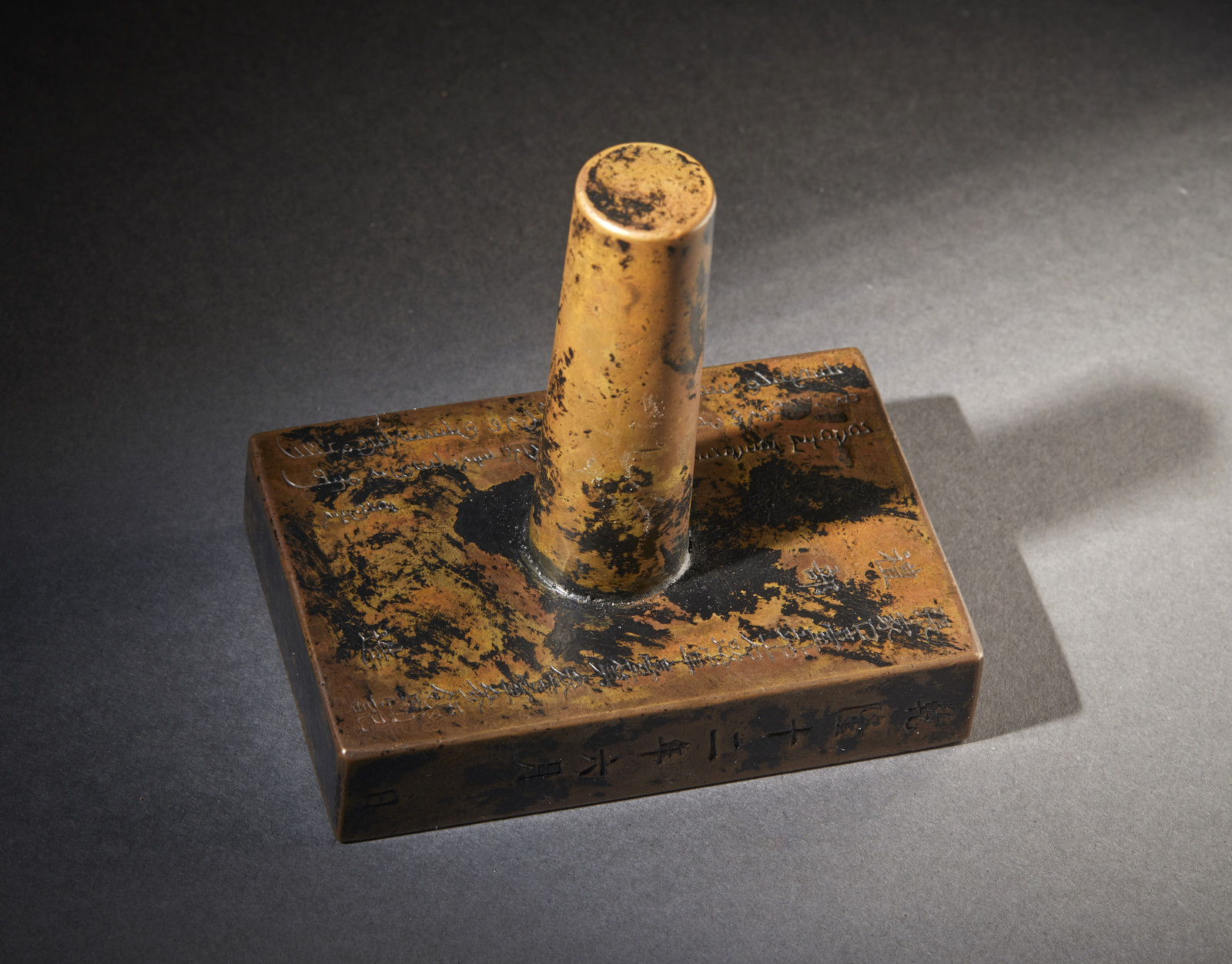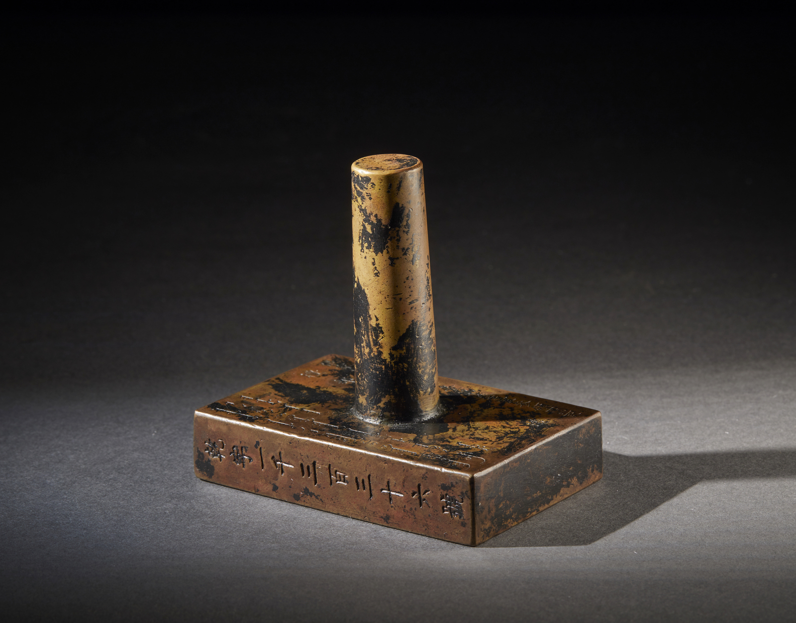 Cina, Qing, periodo Qianlong, XVIII secolo. . Cm 9,00 x 9,00. Importante sigillo in bronzo di forma quadrangolare impiegato in occasione del dispiegamento delle truppe imperiali e contenente iscrizioni in caratteri sigillari cinesi ed in lingua Manciù.