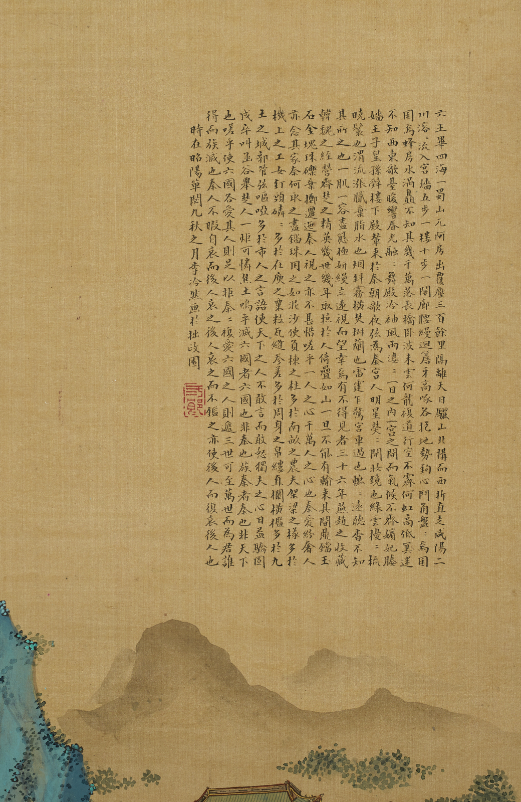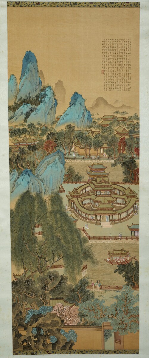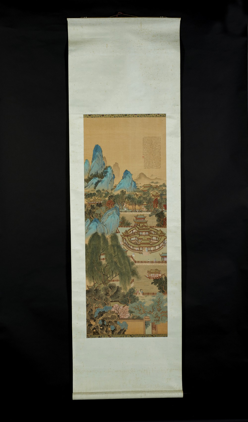 Cina, dinastia Qing, secolo XIX. . Cm 43,50 x 117,20. rotolo verticale a tempera su seta raffigurante un paesaggio immaginario con alte montagne verdi sullo sfondo di un elegante padiglione al centro di giardino fiorito. Questo genere di pittura definito appunto "delle montagne verdi e blu" (qinglu shan-shui) si impose in Cina con i Tang e si rivolgeva ad un pubblico erudito che richiedeva la realizzazione di opere meditative caratterizzate dalla rappresentazione di paesaggi fiabeschi ed immaginari. In epoca Qing ebbe larga diffusione, coniugato con la tecnica jieua ovvero della aggiunta di edifici, per lo più vaghi padiglioni immaginari, realizzati con l'aiuto del righello per creare un contrastante effetto tra le linee dritte e schematiche degli edifici con quelle morbide e sinuose del paesaggio circostante e sempre -come testimoniato anche in questo caso dal lungo colophon- veniva inteso come un omaggio alla grande pittura erudita dell'epoca d'oro cinese.