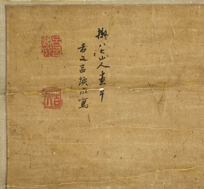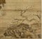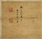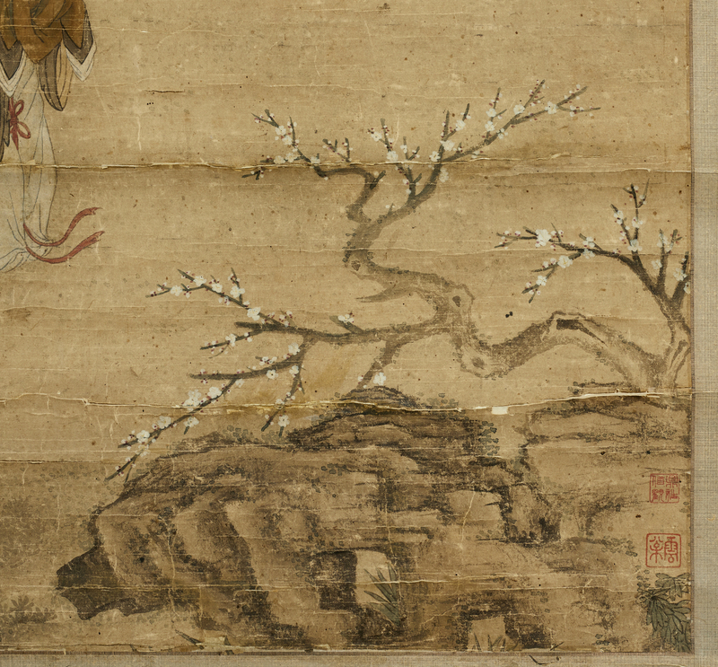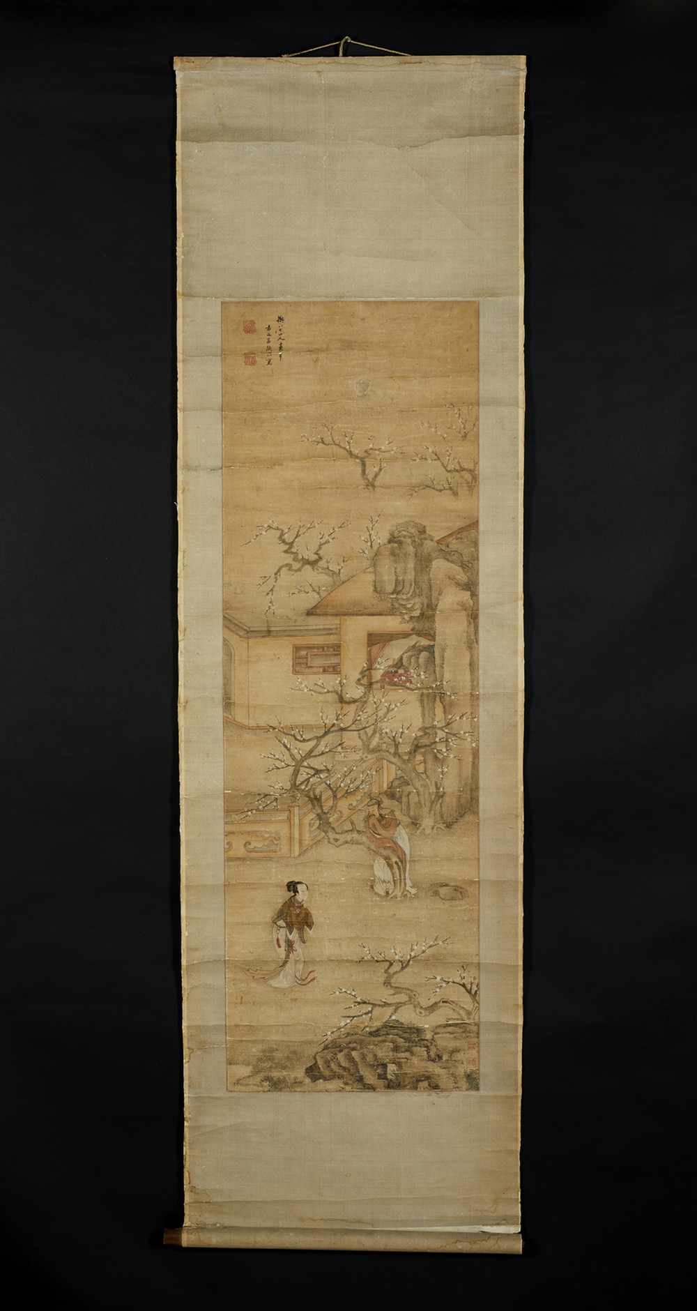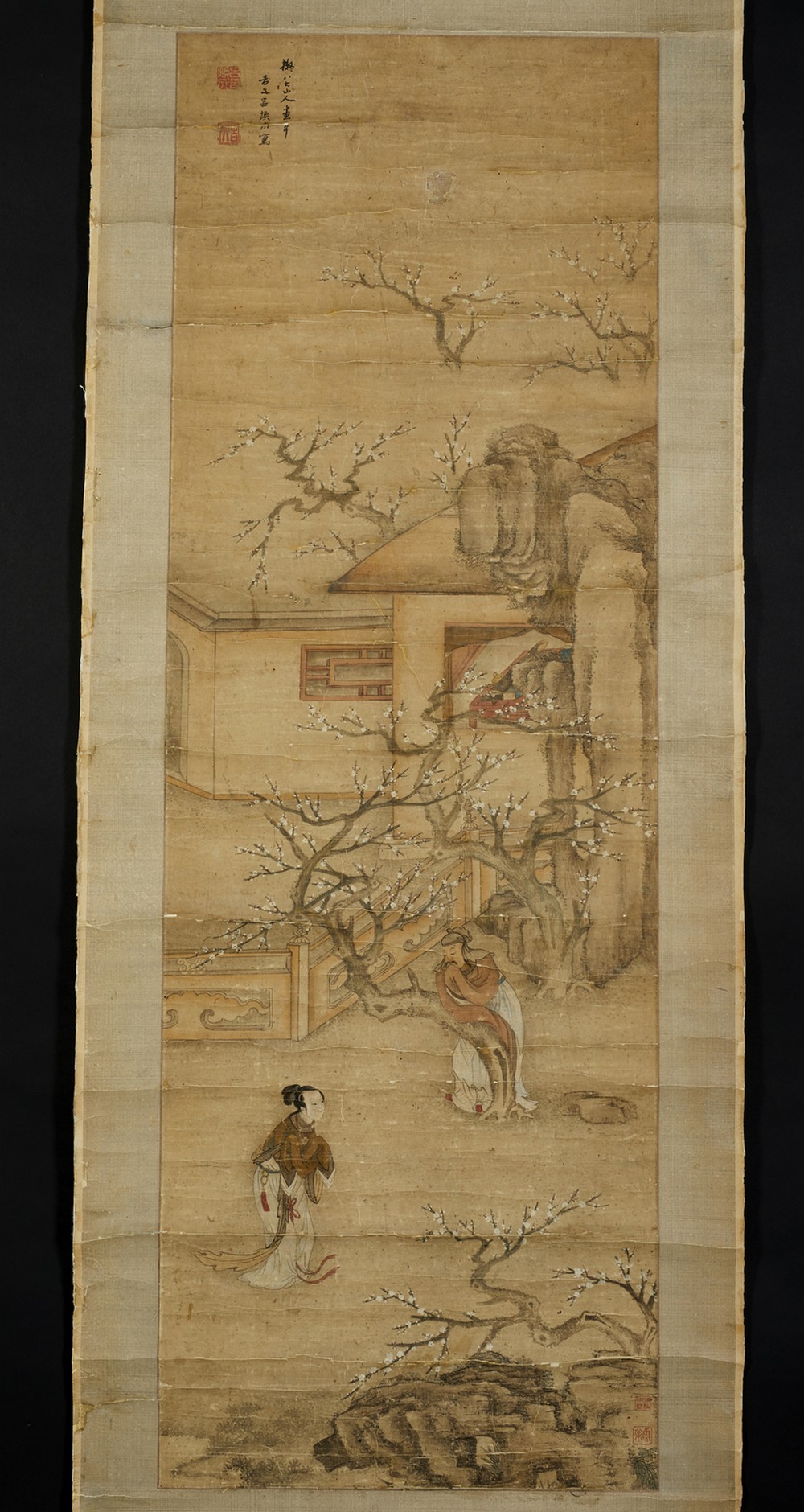 Cina, dinastia Qing, XIX secolo . . Cm 39,00 x 119,00. rotolo verticale dipinto a tempera su carta raffigurante un giardino con alberi di pruno in fiore, una ricca dimora e due figure elegantemente vestite. Il rotolo presente in alto a sinistra iscrizione a due colonne e doppio sigillo in rosso. Misura completa del rotolo: cm 176x54