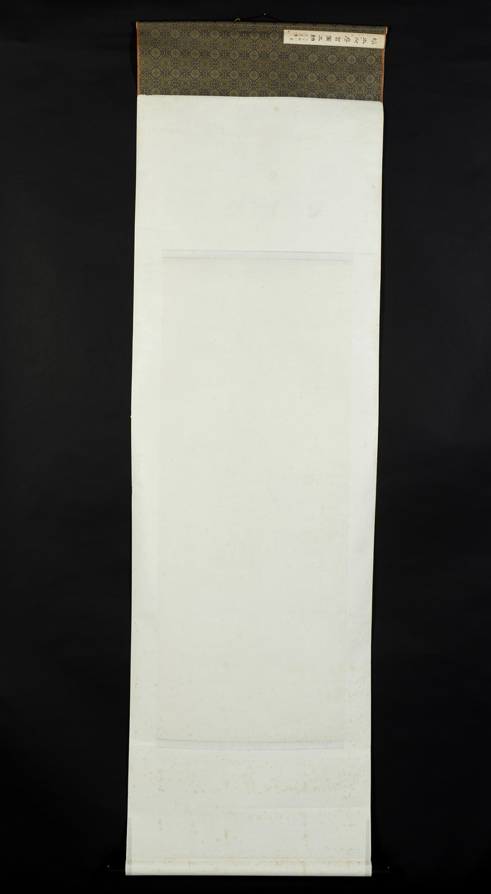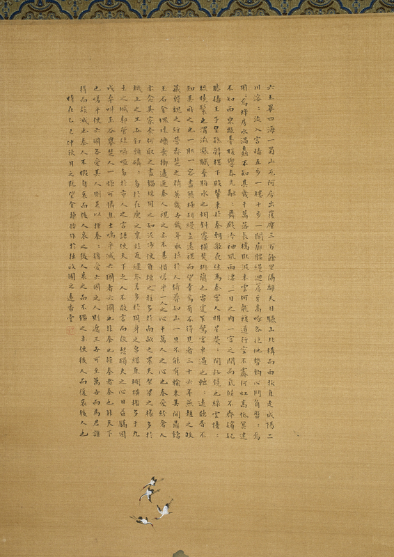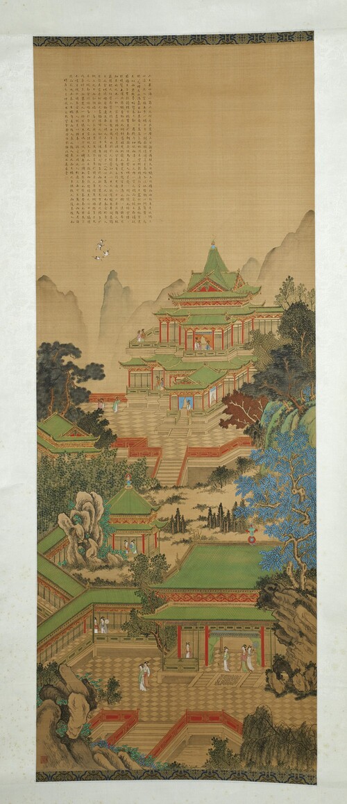 Cina, dinastia Qing, XIX secolo . . Cm 44,50 x 117,00. Grande rotolo verticale su carta dipinto secondo la tecnica jiehua e raffigurante un imponente complesso di edifici regali inseriti in un contesto di paesaggio montano. Misure complessive: rotolo 198 X 59 cm