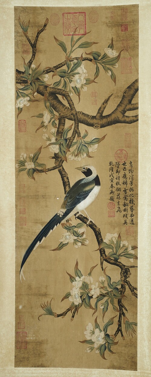 Cina, dinastia Qing, inizi XX secolo. . Cm 43,00 x 125,00. Elegante dipinto su rotolo verticale, raffigurante un grande volatile dalla lunga coda su un ramo fiorito di magnolia. Misure totali: h. 177 X 54 cm