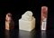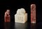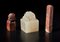 Cina, dinastia Qing, XIX secolo. . Cm 7,80 x 11,00. Un grande sigillo in quarzo rosa e due sigilli in pietra saponaria rossa.