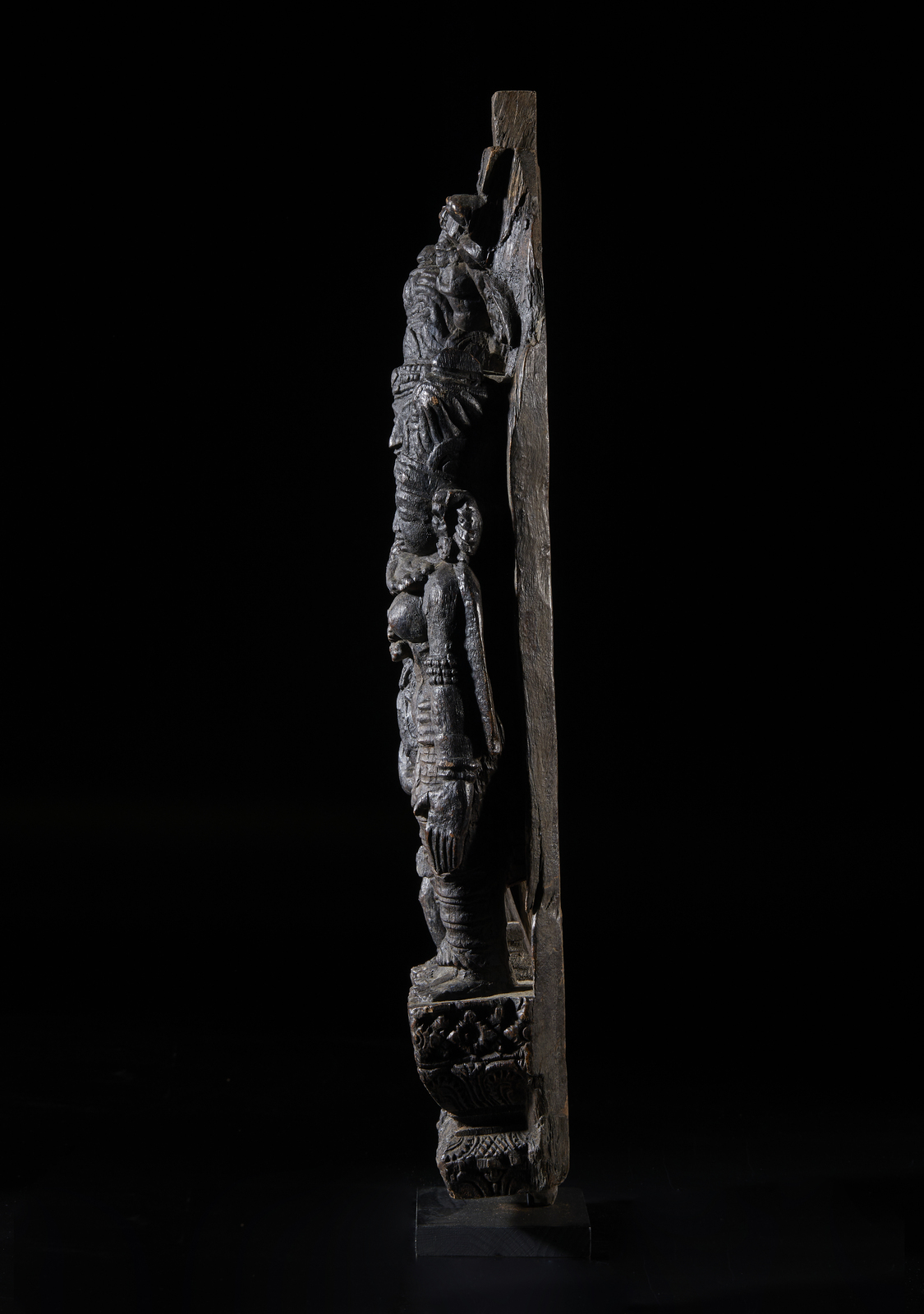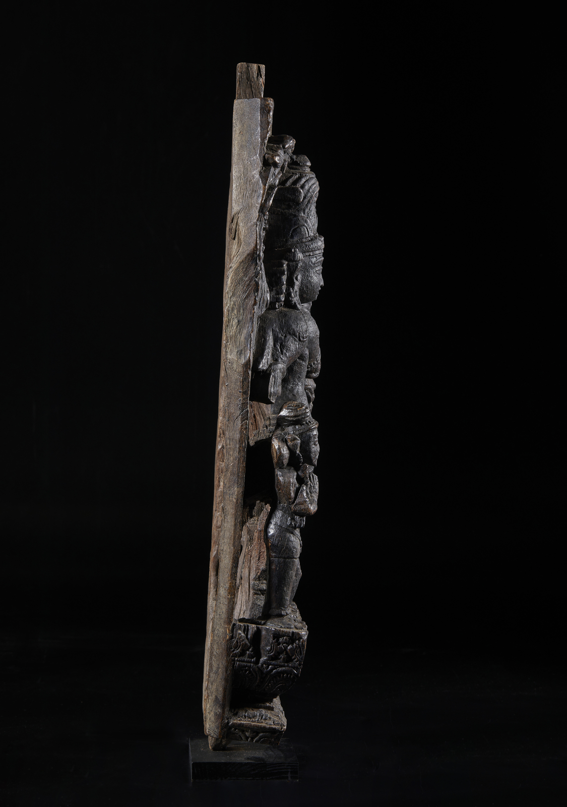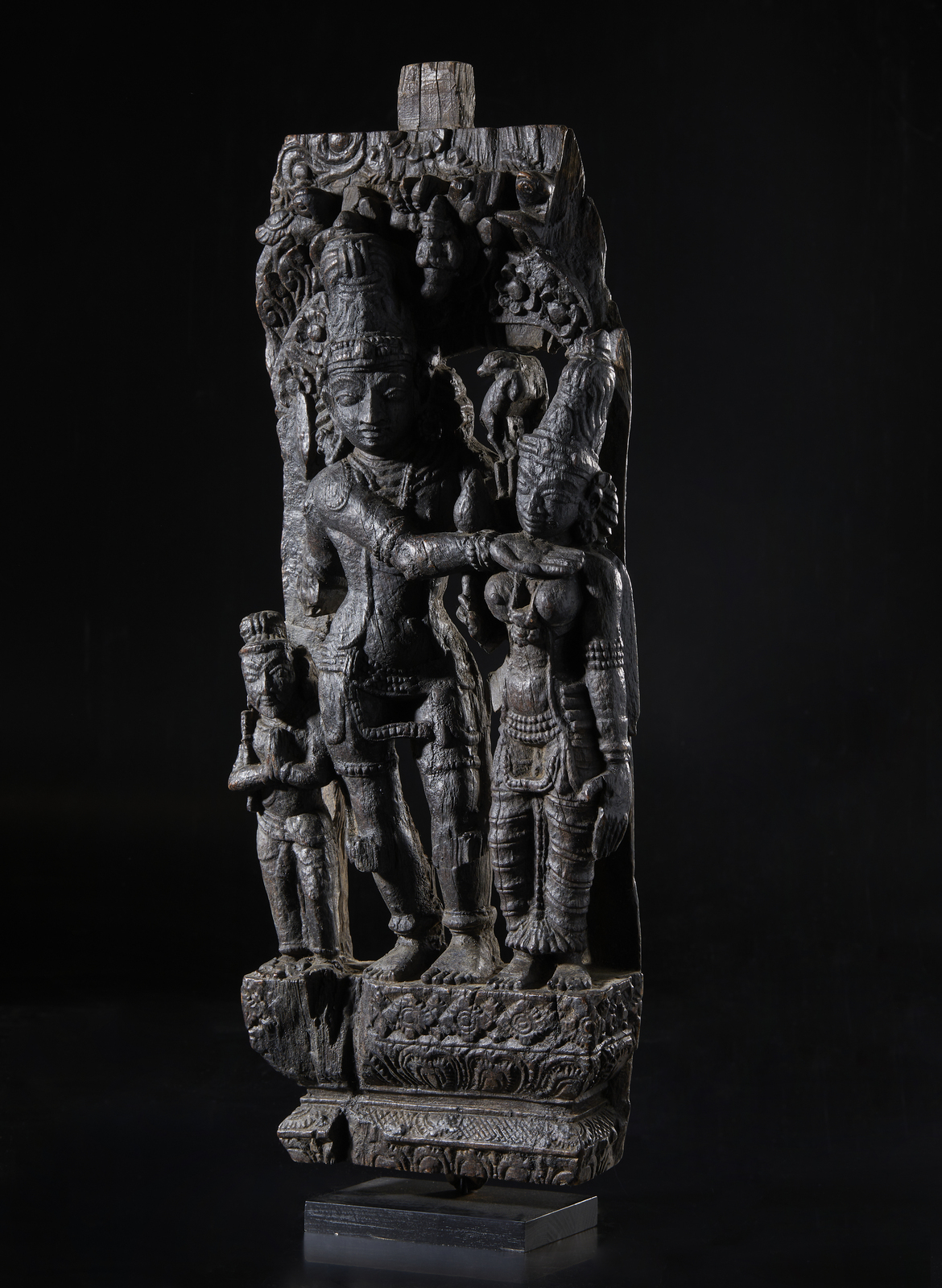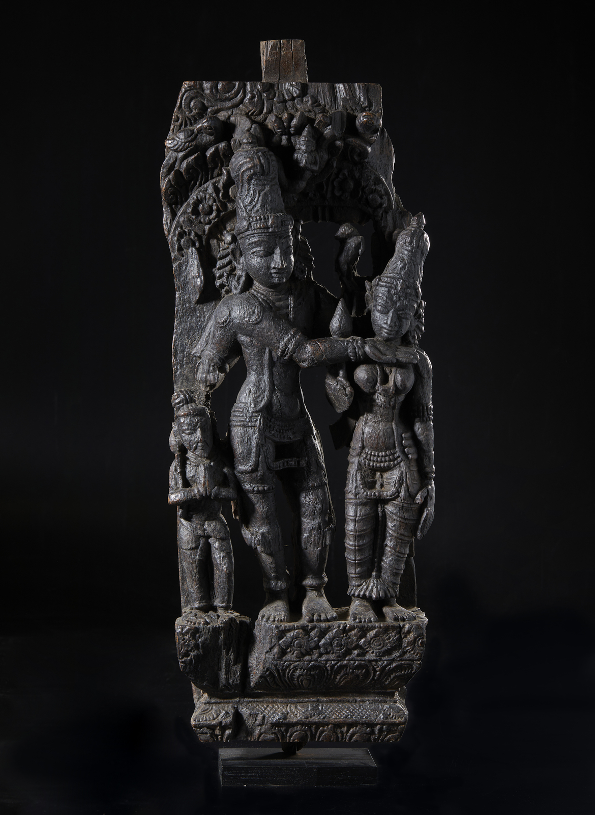 India, XVIII secolo . . Cm 25,00 x 72,50. Parte di carro cerimoniale in legno tenero intagliato con la figura di Shiva in posizione centrale, la moglie Parvati alla sua sinistra ed un orante sulla destra. I personaggi si stagliano contro una prabha decorata con fitti elementi vegetali e floreali.