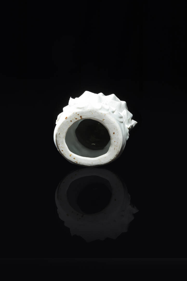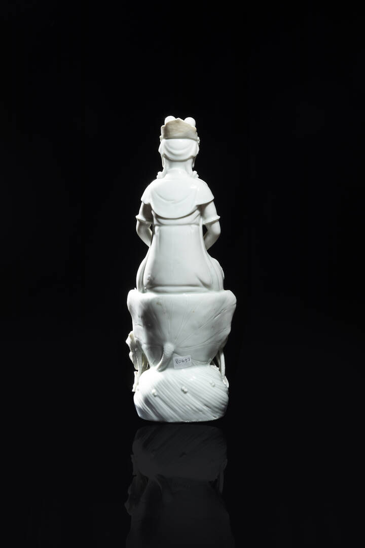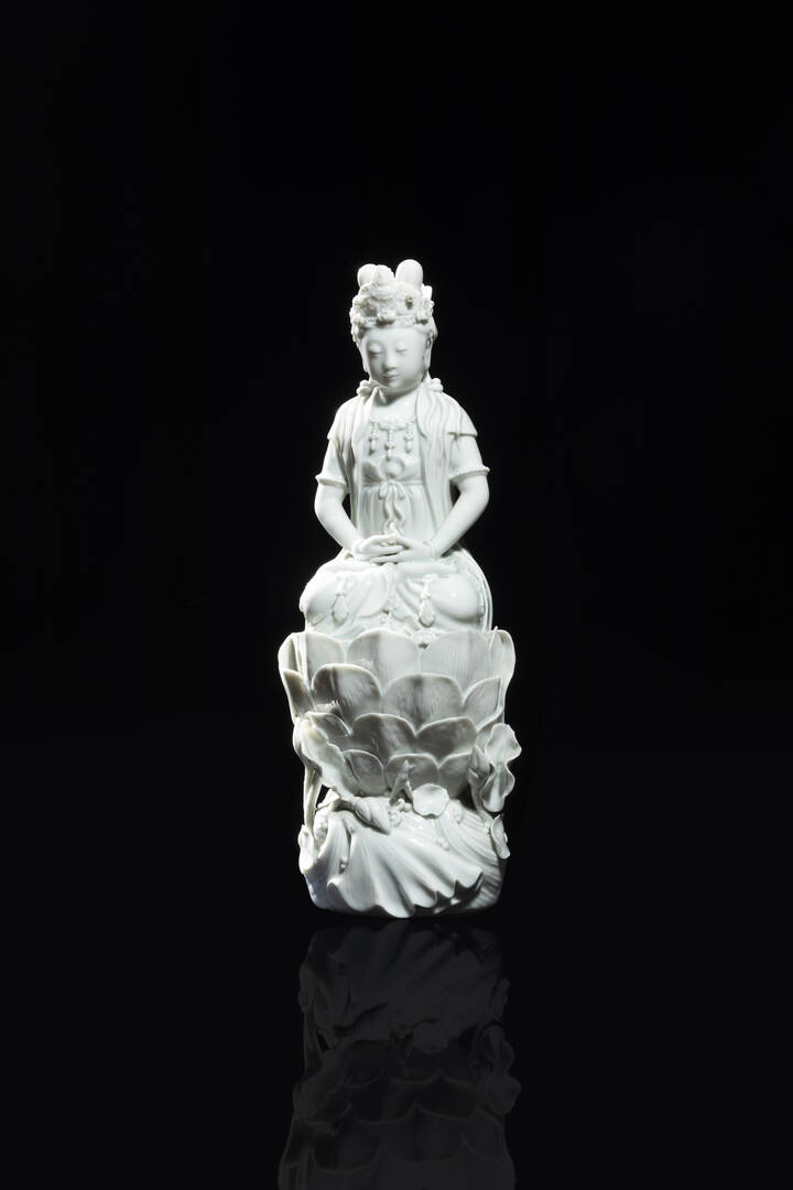 Guanyin in porcellana blanc de chine seduta su fiore di loto, Cina, Repubblica, XX sec