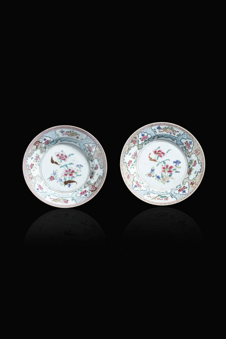 Coppia di piatti in porcellana Famiglia Rosa Compagnia delle Indie Orientali, Cina, XVIII secolo.