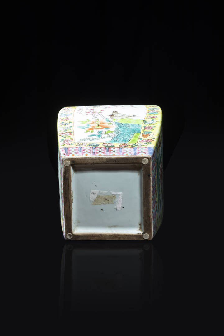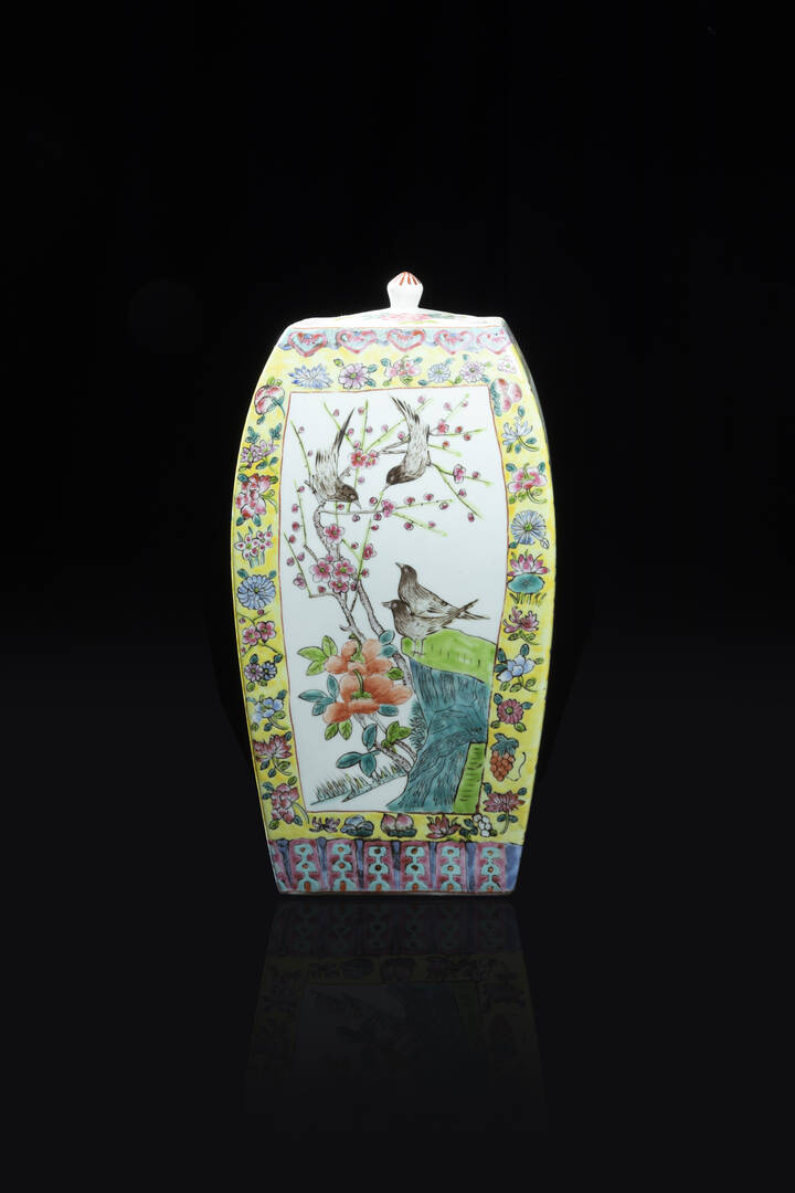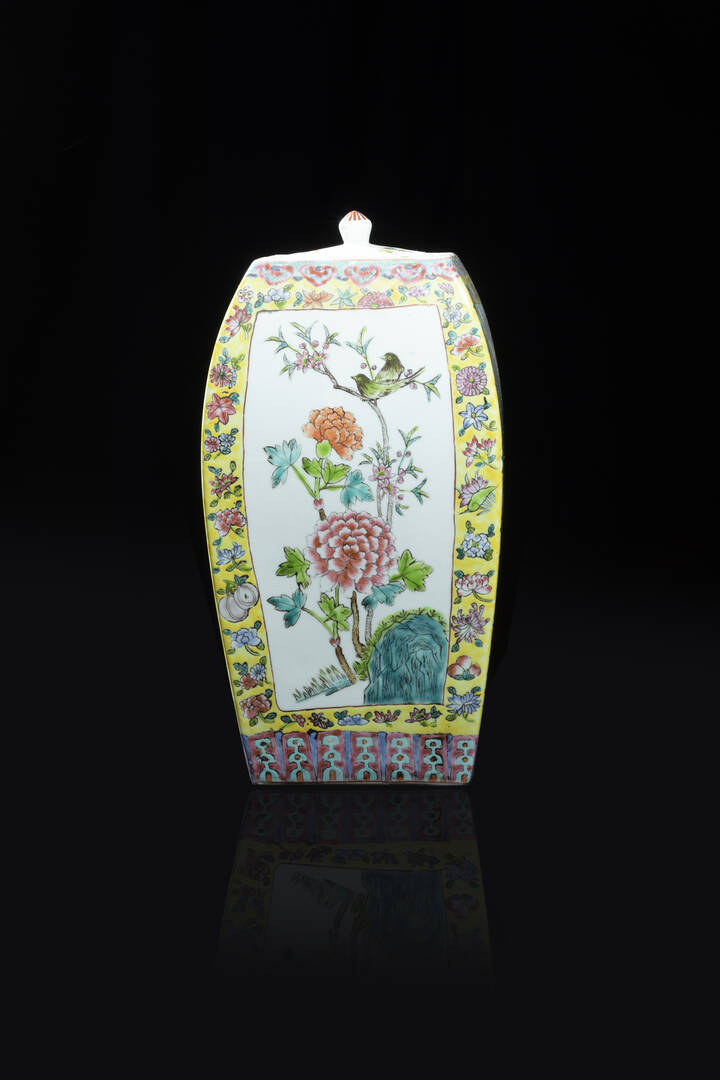 Vaso in porcellana di forma quadrata con coperchio, dipinto con fiori e uccelli, Cina, Repubblica, XX sec