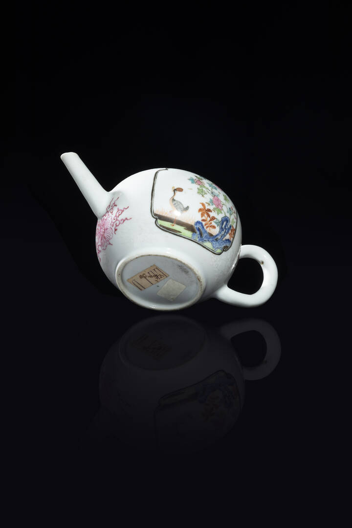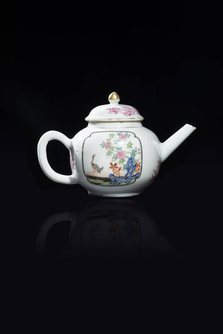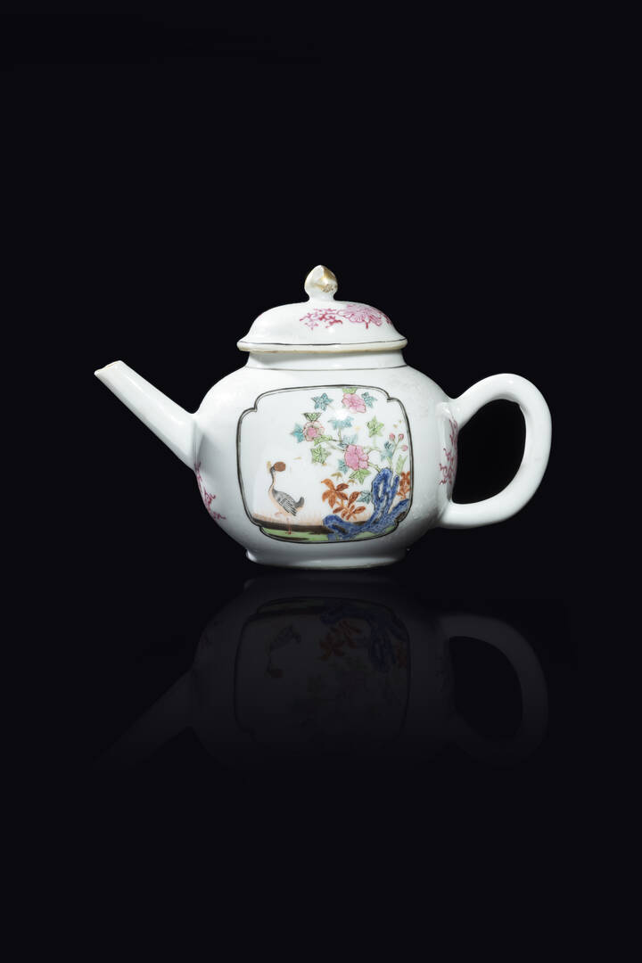 Teiera in porcellana Famiglia Rosa raffigurante soggetti naturalistici e decori floreali, Cina, dinastia Qing, epoca Qianlong (1736-1796)