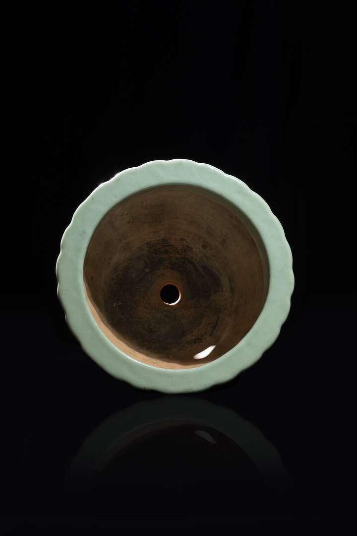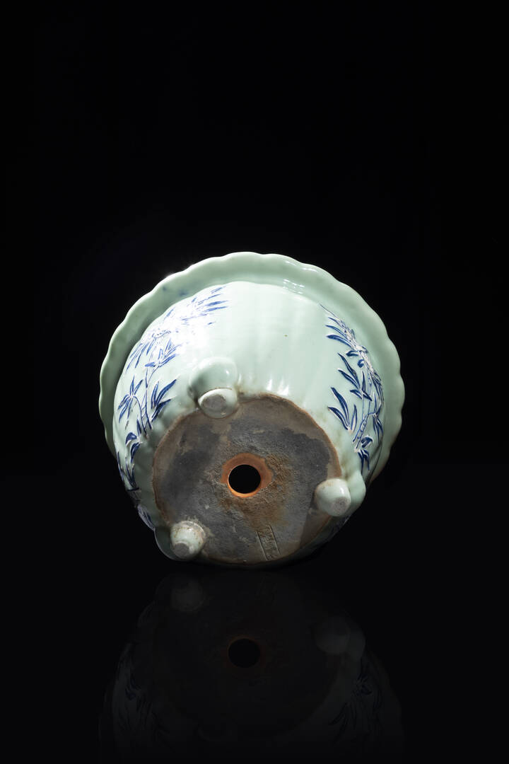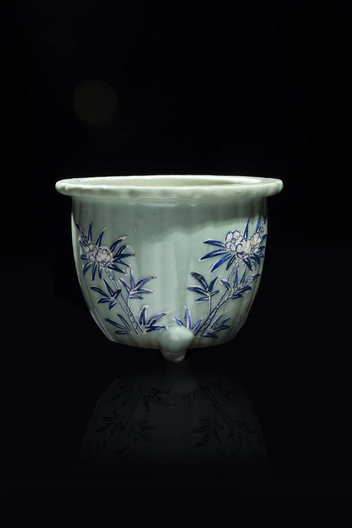 Fioriera in porcellana color celadon dipinta con fiori bianchi e blu, Cina, Repubblica, XX sec.
