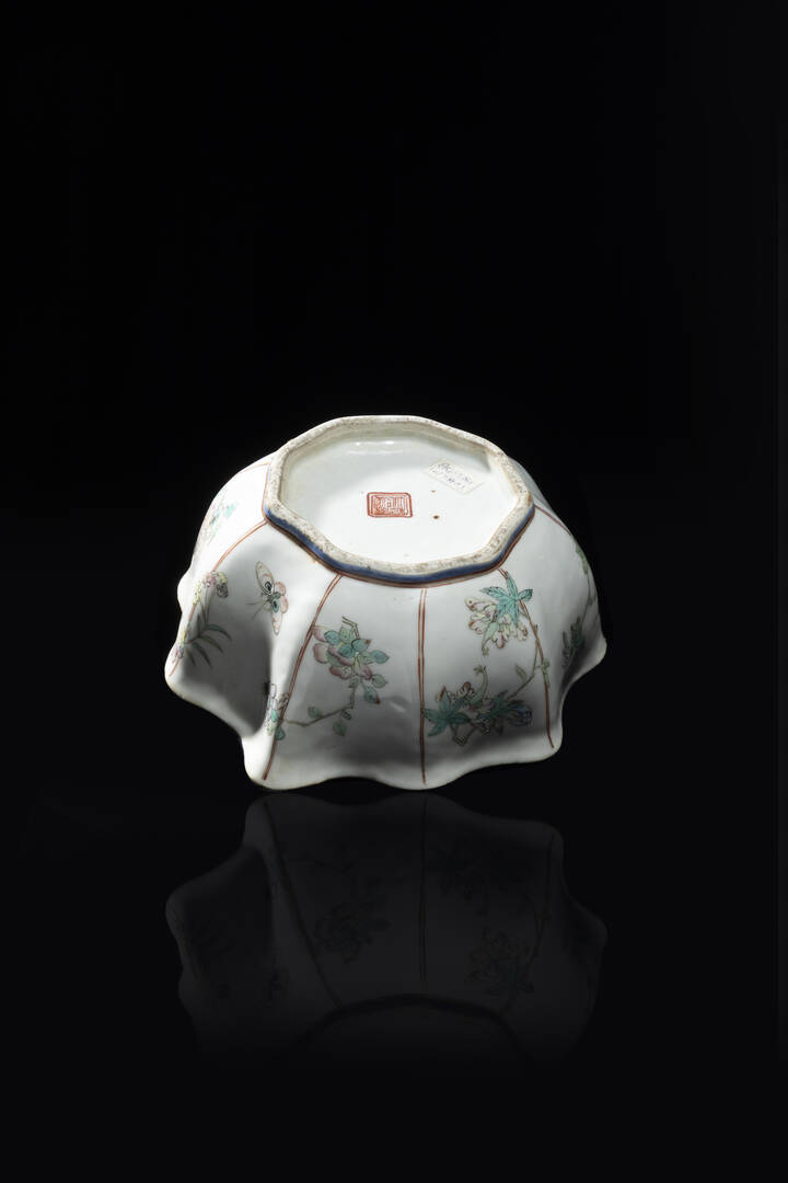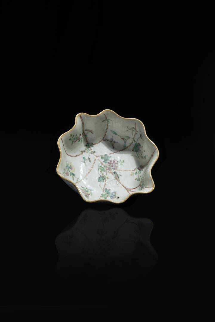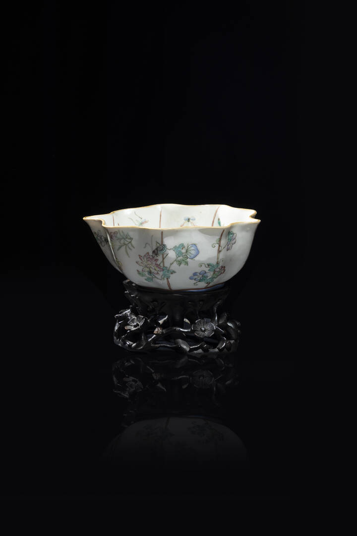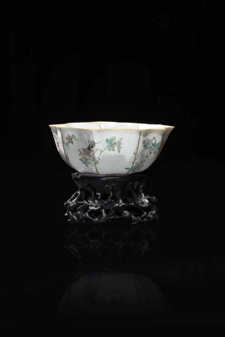 Coppa in porcellana a forma di foglia, dipinta con insetti tra i rami, con base in legno, Cina, dinastia Tongzhi, (1861-1875)