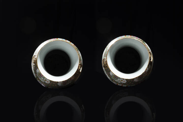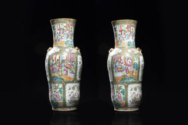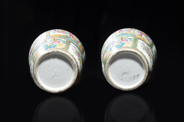 Coppia di vasi in porcellana Canton dipinti con scene di corte, Cina, dinastina Qing, XIX sec.