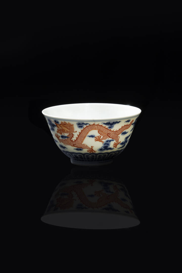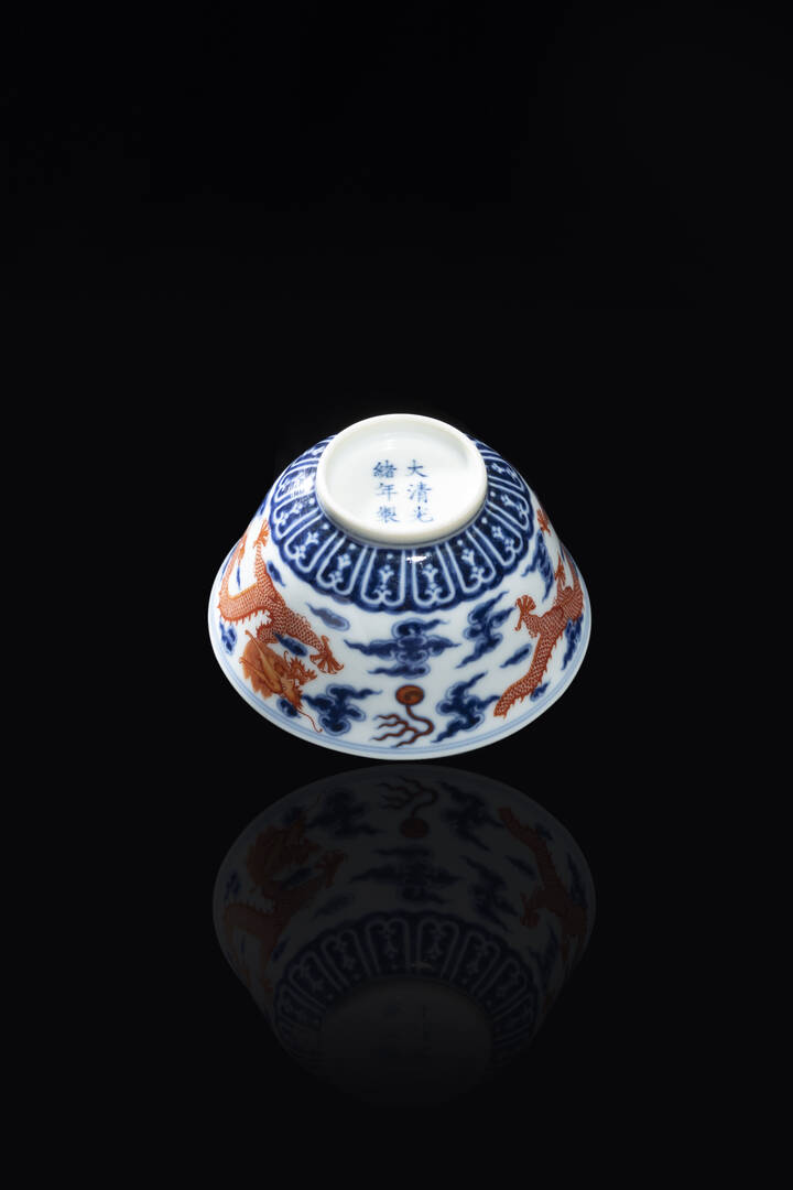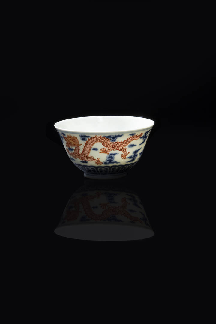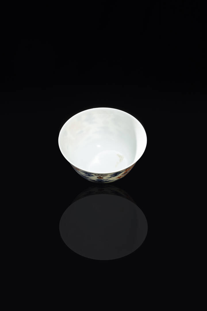 Coppetta in porcellana bianco e blu con draghi rossi, Cina, Repubblica, XX sec.