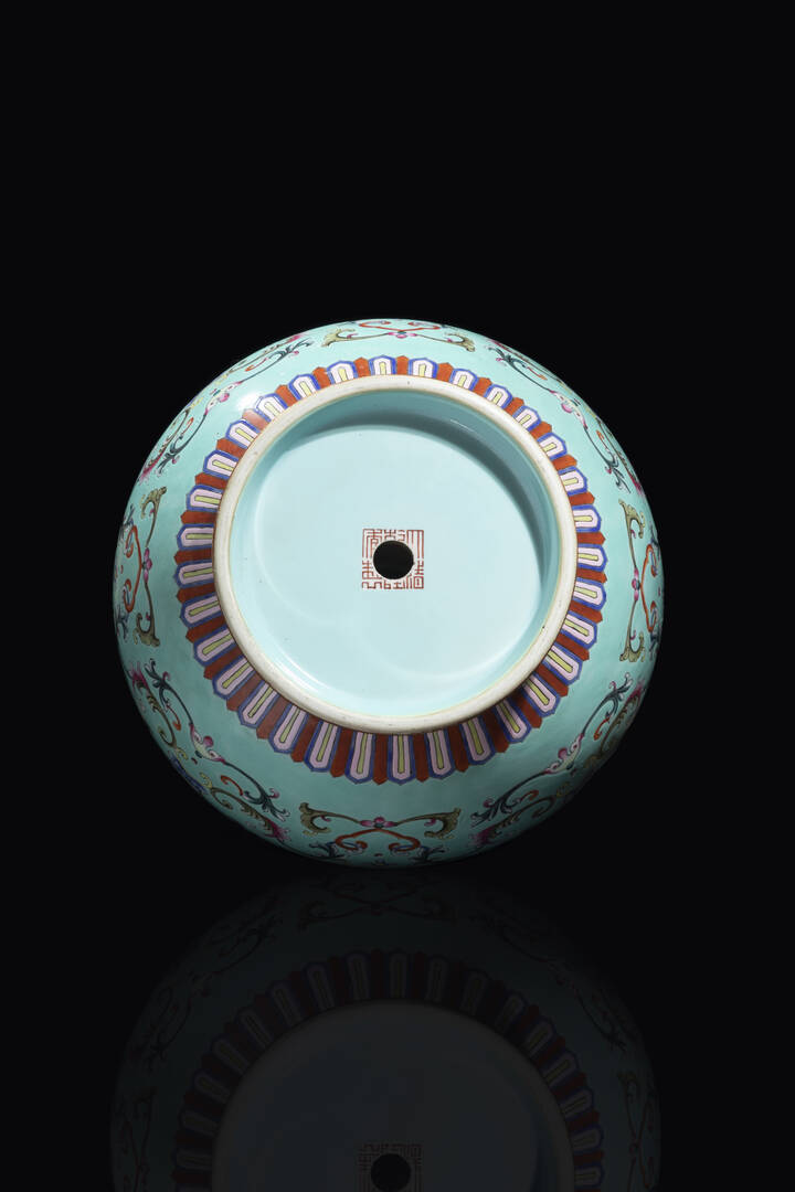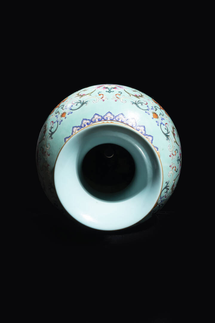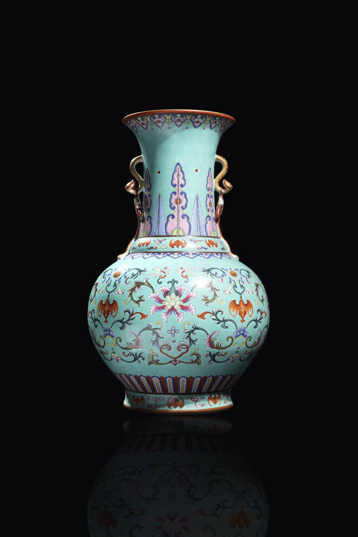 Vaso in porcellana Famiglia Rosa con decori di fiori e pipistrelli su fondo turchese, Cina, dinastia Qing, XIX sec