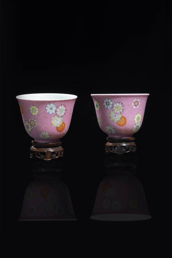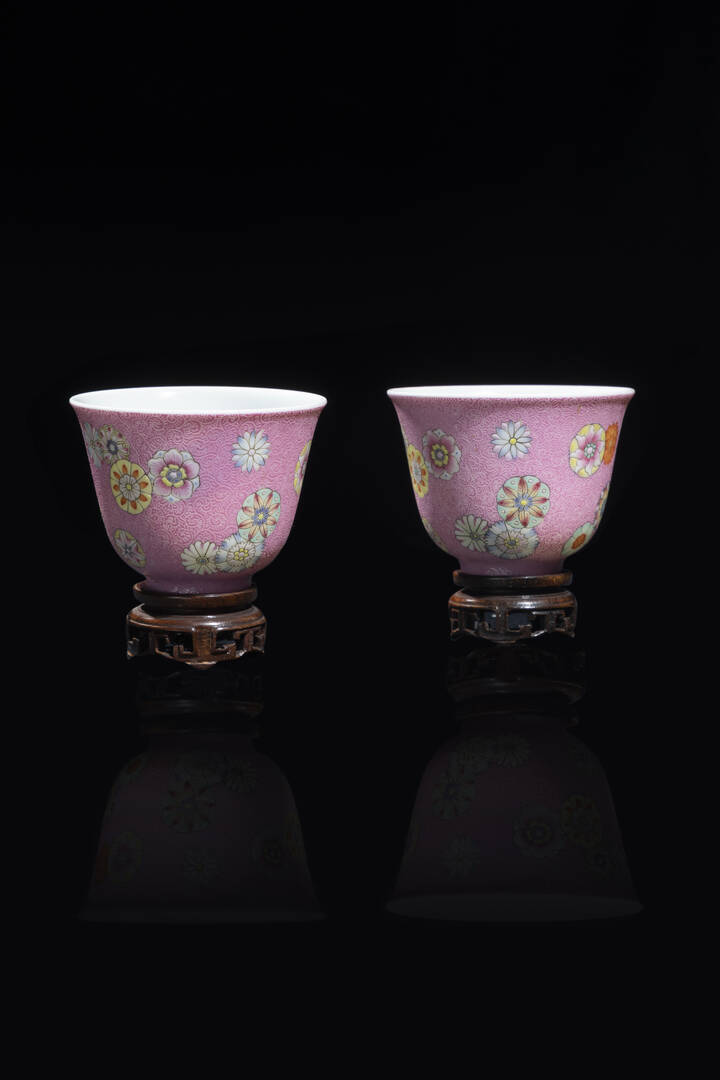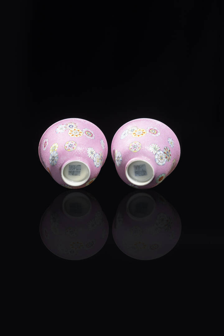 Coppia di tazzine Famiglia Rosa con decori a palloni, Cina, dinastia Qing, XIX sec., marchio apocrigo Qianlong