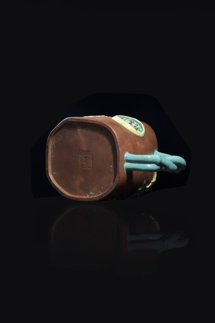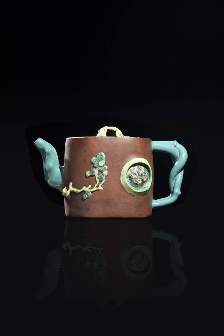 Teiera in porcellana Yixing parzialmente smaltata con decoro di rami in fiore a rilievo, Cina, dinastia Qing, XIX Sec.