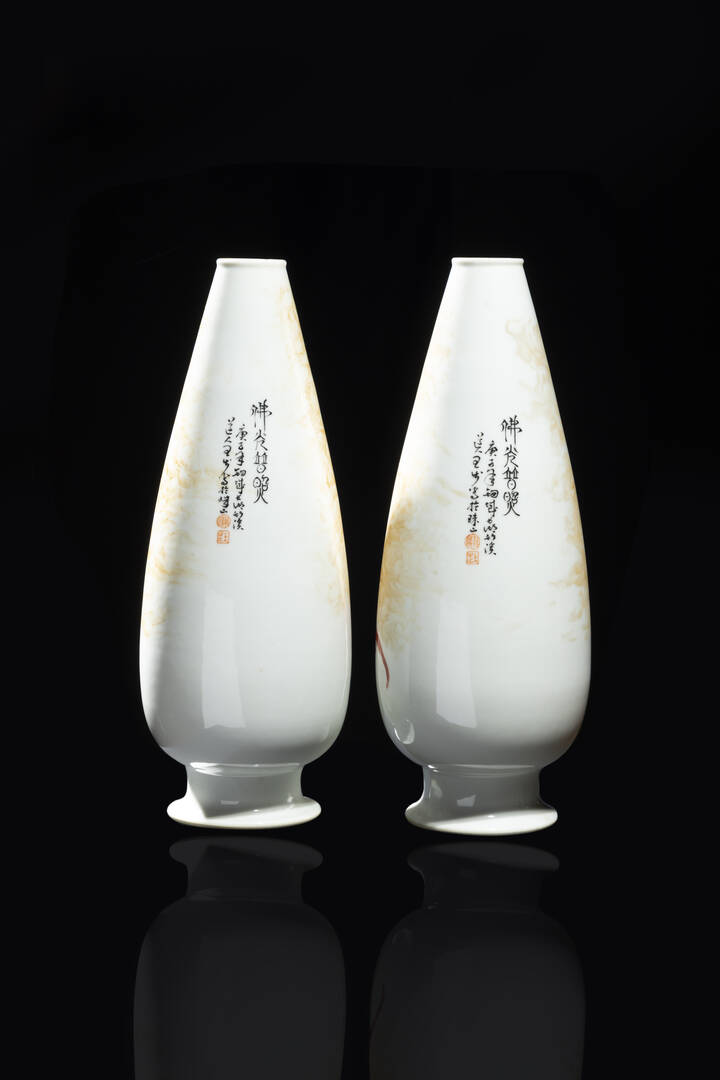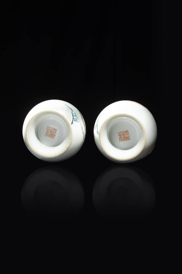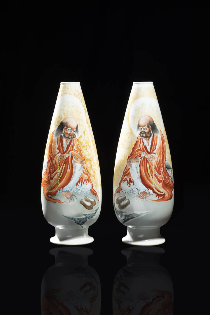Coppia di vasi in porcellana dipinti con Lohan e iscrizioni, Cina, Repubblica, XX sec