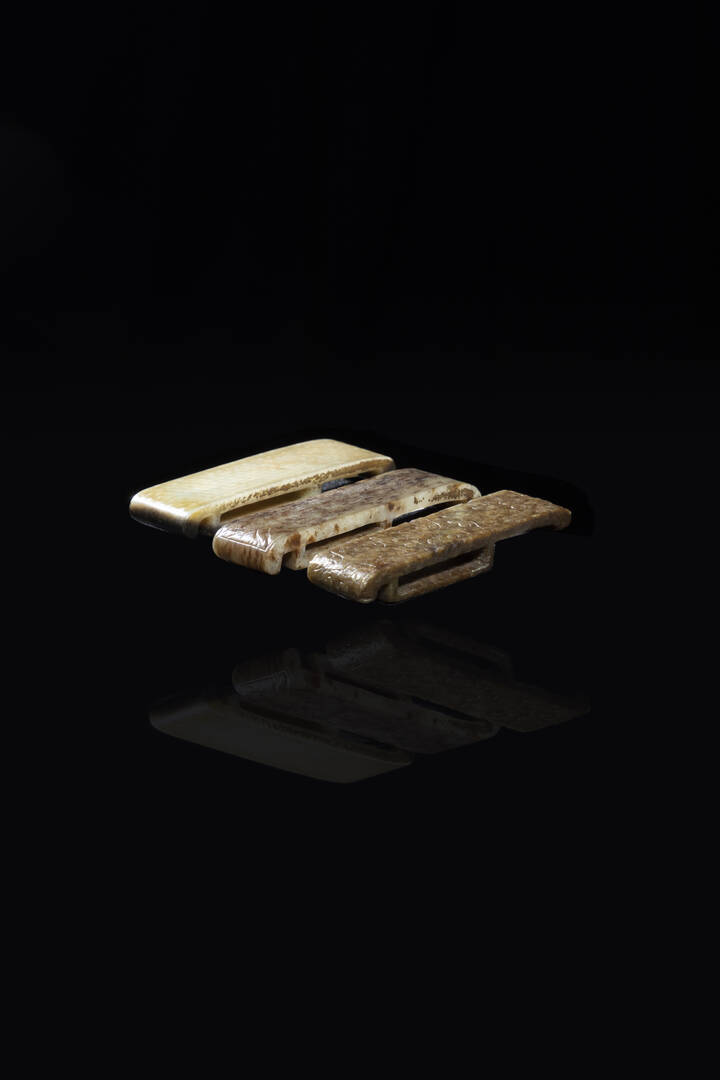 Lotto composto da tre fibbie in giada celadon con russet, Cina, dinastia Ming, XVII sec