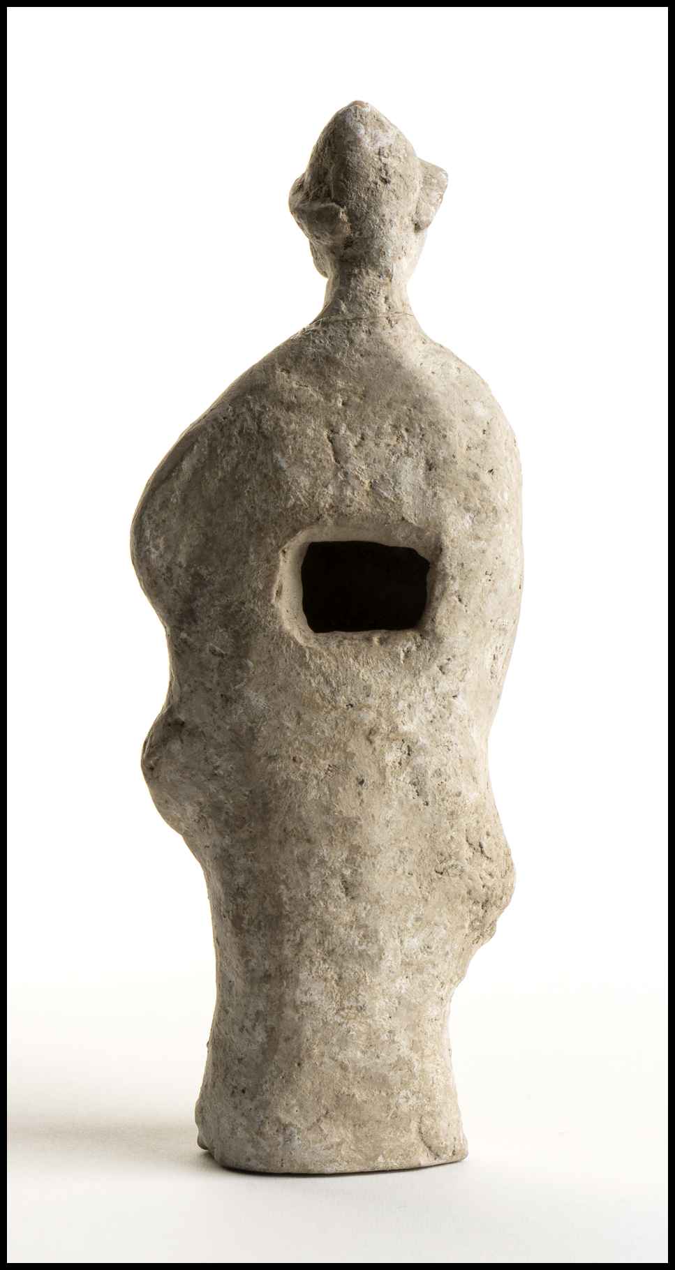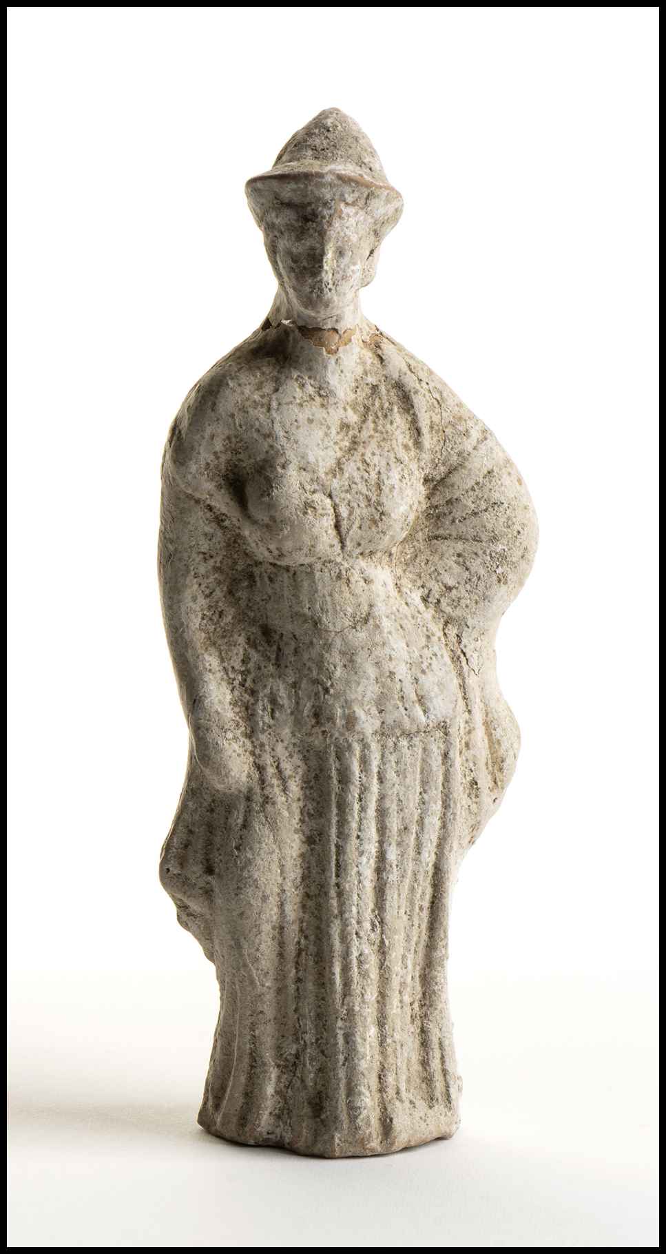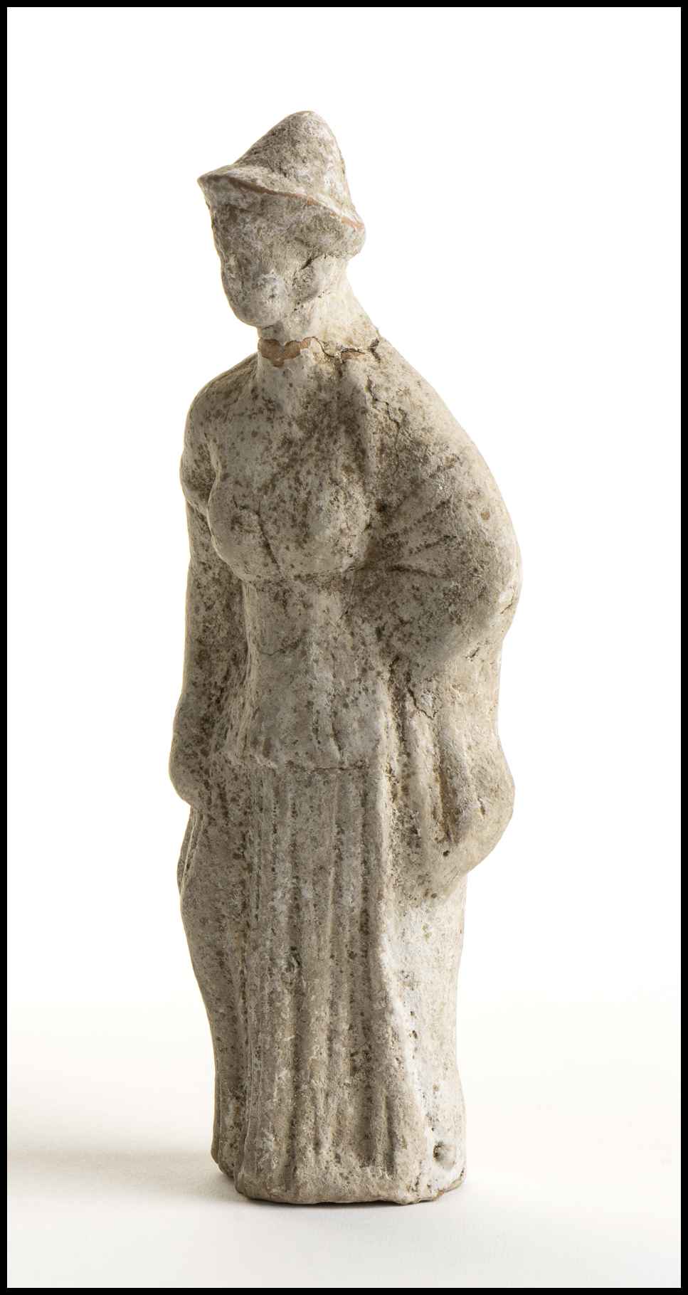 Statuetta femminile in terracotta indossante un copricapo conico, un lungo chitone plissettato ed un himation drappeggiato sulle spalle che copre parte del braccio destro ed interamente il sinistro. Scialbatura sull'intera superficie; interno cavo; foro di sfiato posteriore; restauro sul collo.