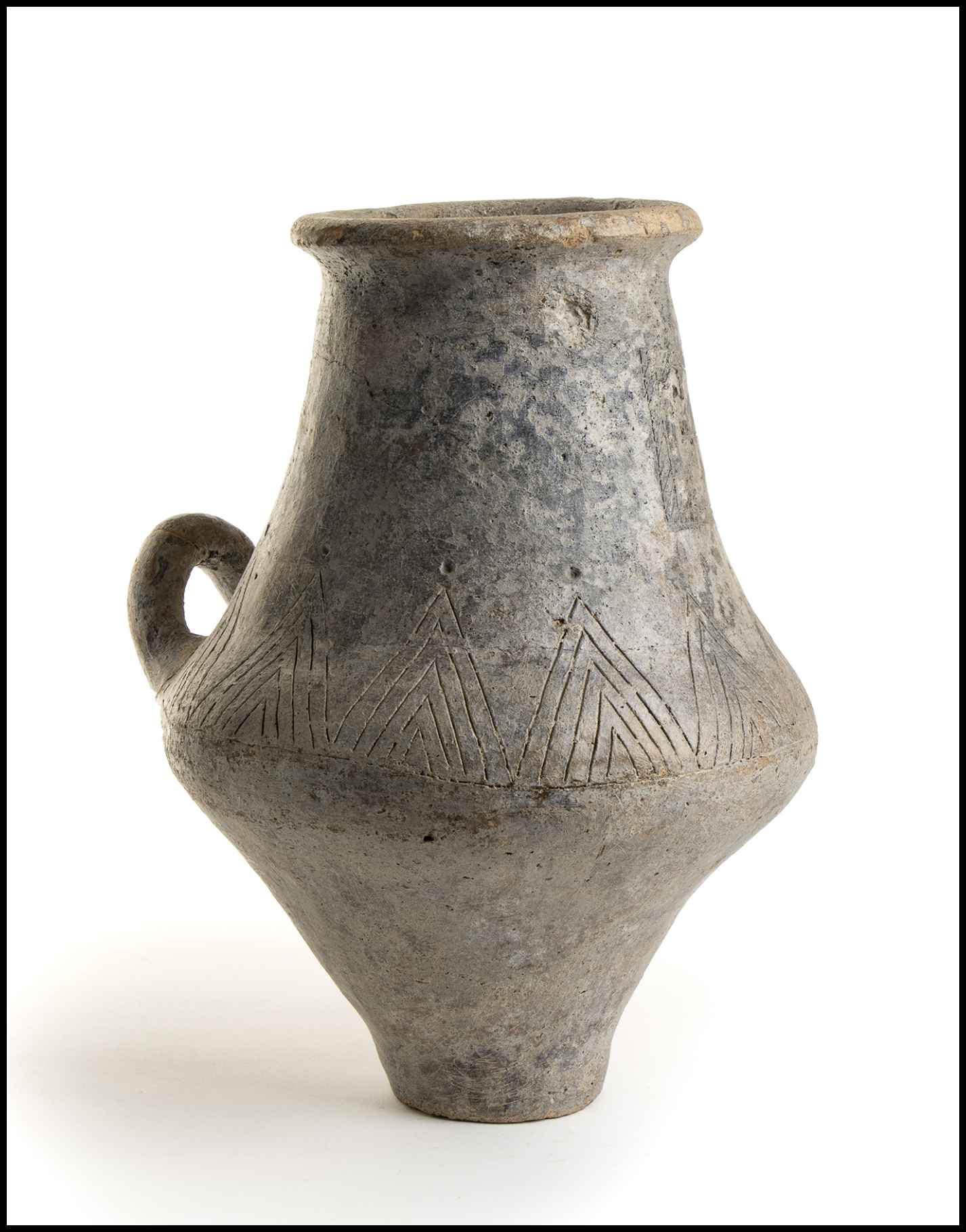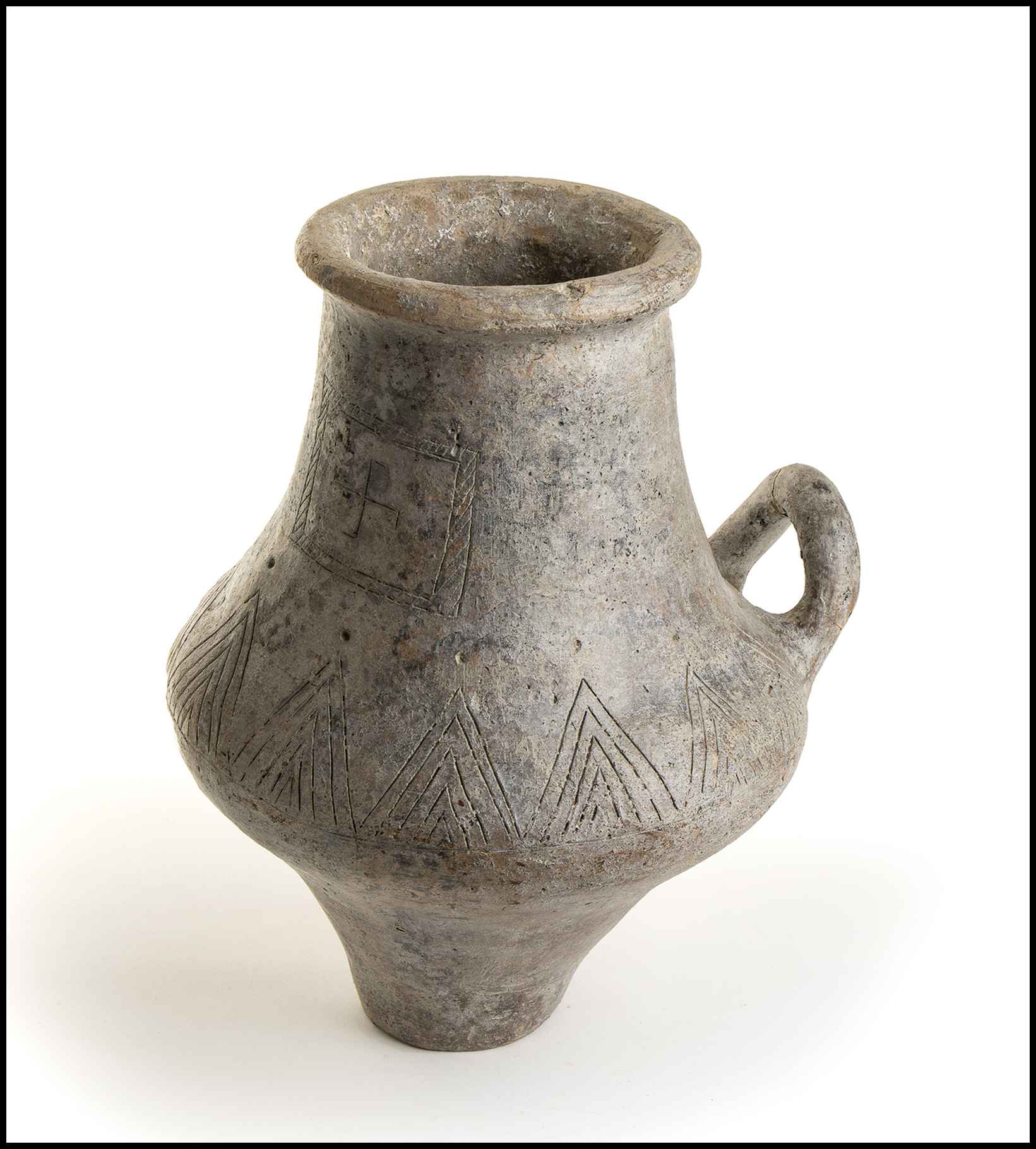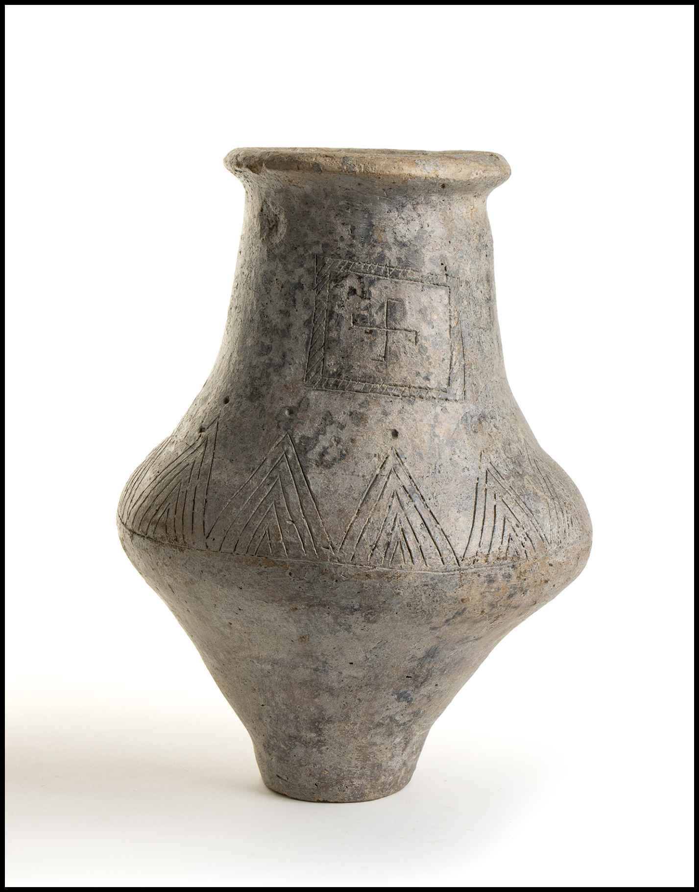 Cinerario in impasto con ansa a bastoncello impostata obliquamente sulla massima espansione del corpo e ritorta verso l’alto. Corpo decorato da fila di triangoli e da croce uncinata entro cornice. Restauro sull'ansa, per il resto intatto.