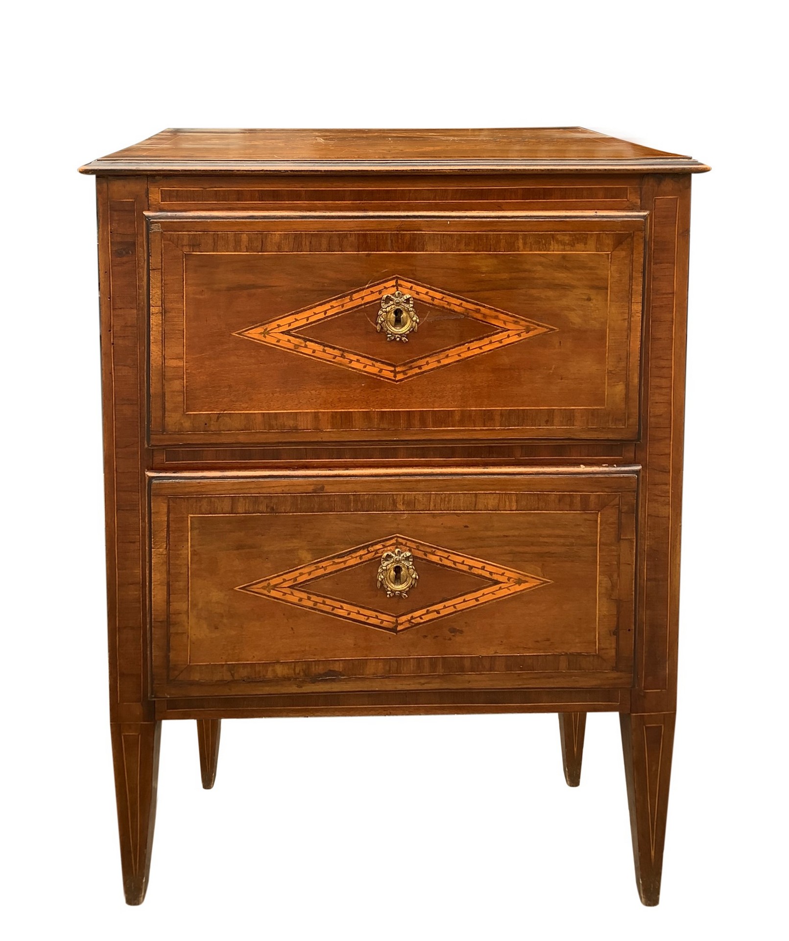 Comodino a due cassetti tardo Luigi XVI in legno di noce con losanghe al fronte, al piano e ai lati e piedi tronco piramidali, 19° secolo