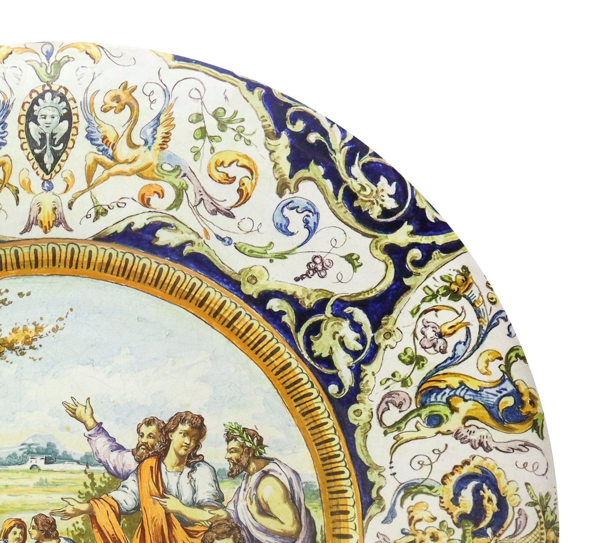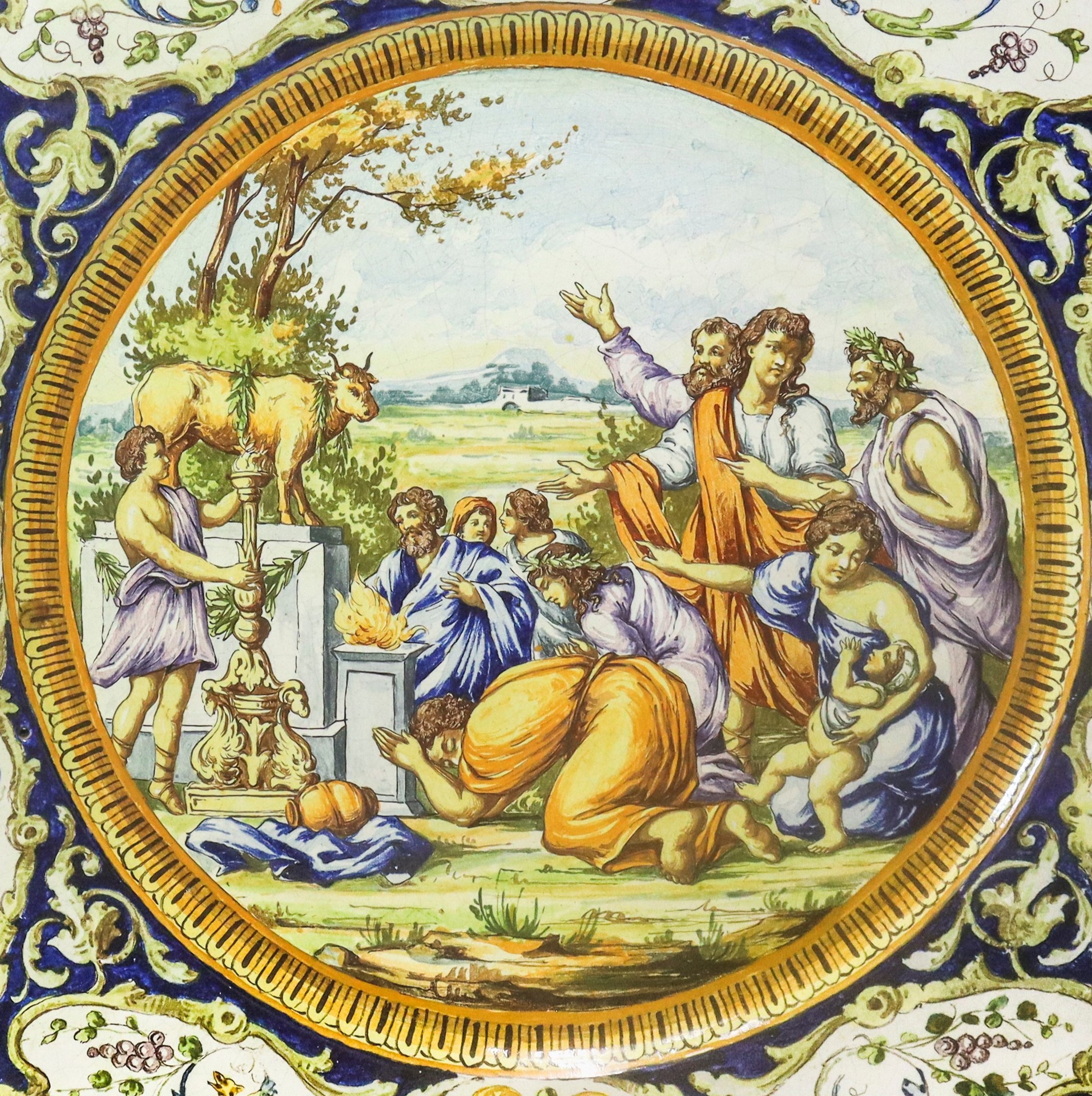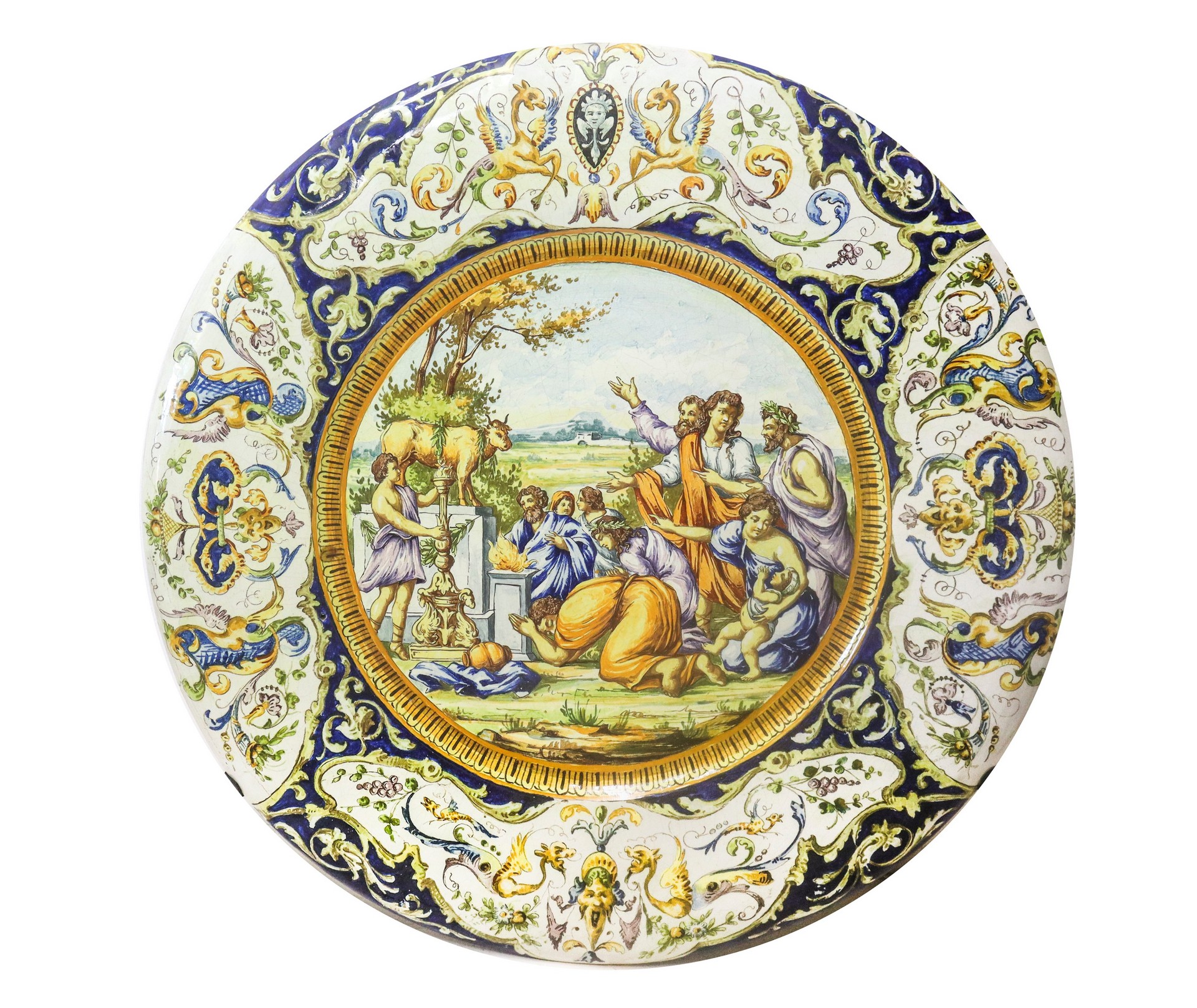 Antica manifattura napoletana Giovanni Mollica (Napoli 1842) - Grande Piatto in maiolica, raffigurante Adorazione del Vitello d'oro da parte degli Ebrei durante l'assenza di Mosè, 20° secolo