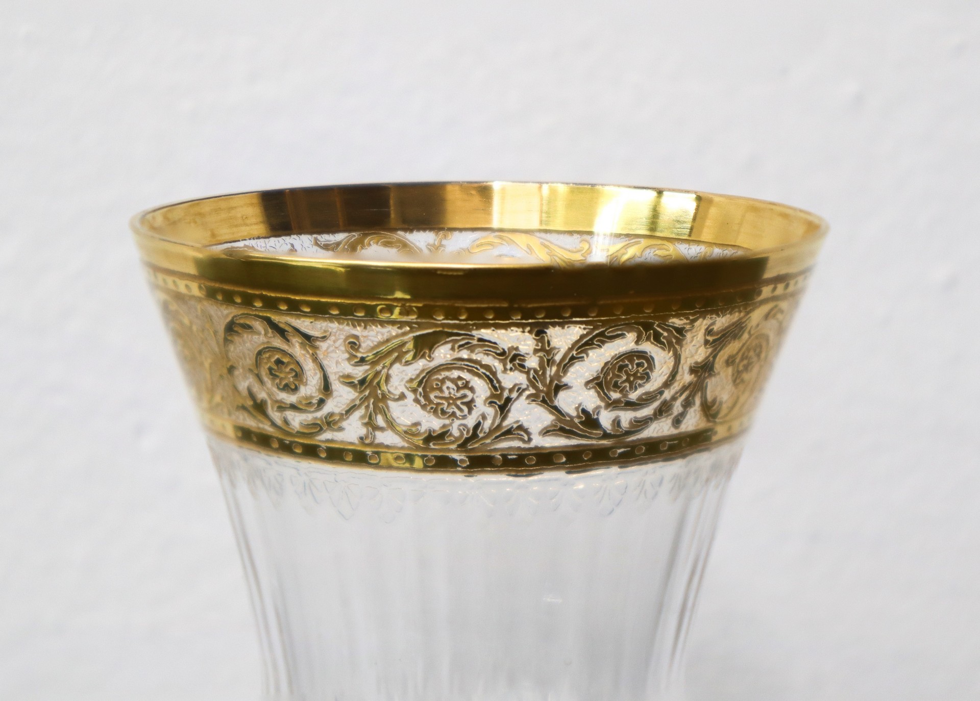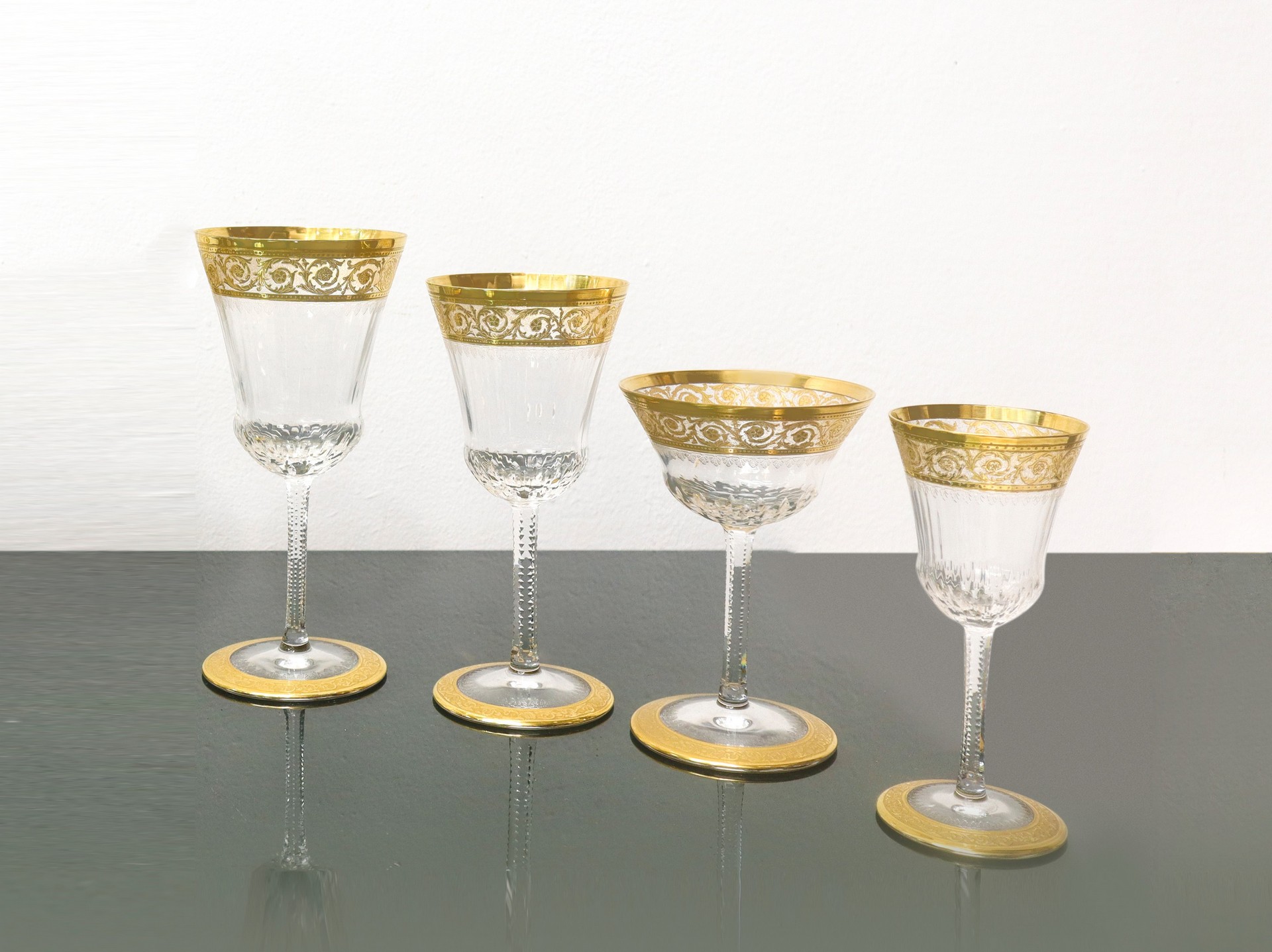 St.Louis - Servizio di N. 48 bicchieri e bottiglie, decoro 'THISTLE GOLD', 20° secolo 12 bicchieri acqua, 12 bicchieri vino, 12 coppe , 12 liquore , 2 caraffe e 2 bottiglie vino12 bicchieri acqua, 12 bicchieri vino, 12 coppe , 12 liquore , 2 caraffe e 2 bottiglie vino