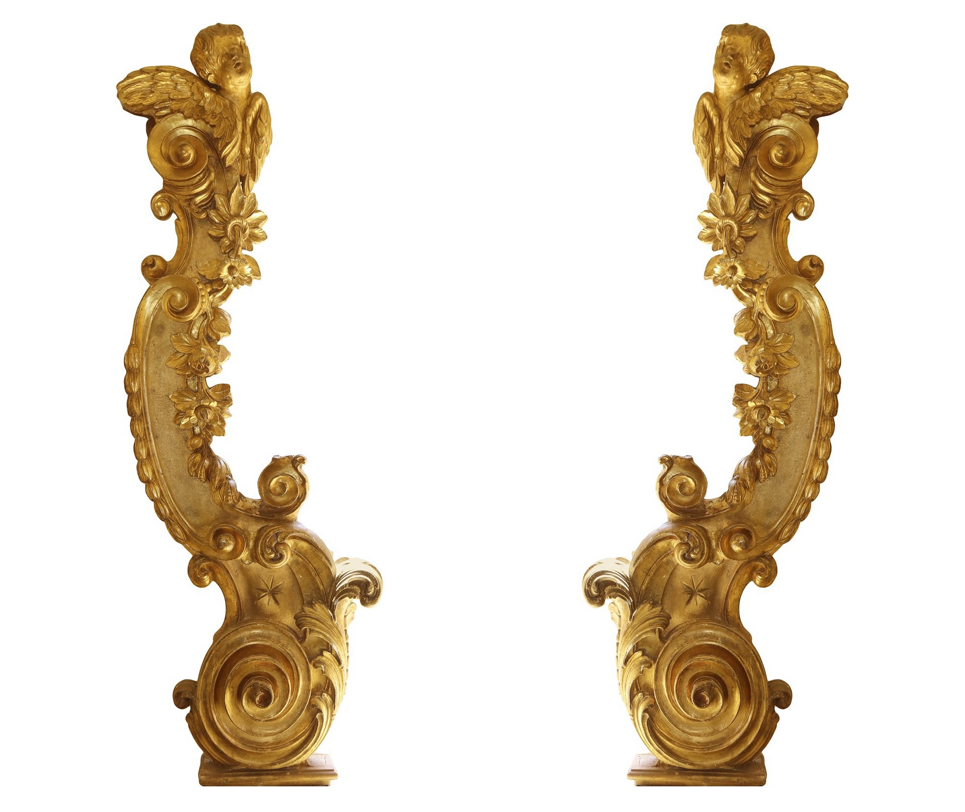 Importanti fregi in legno dorato, XVIII secolo cm 260 x cm 67 Ornamentato con fiori e putti in cima. Provenienza Famiglia Paternò Castello di Biscari.Ornamentato con fiori e putti in cima. Provenienza Famiglia Paternò Castello di Biscari.